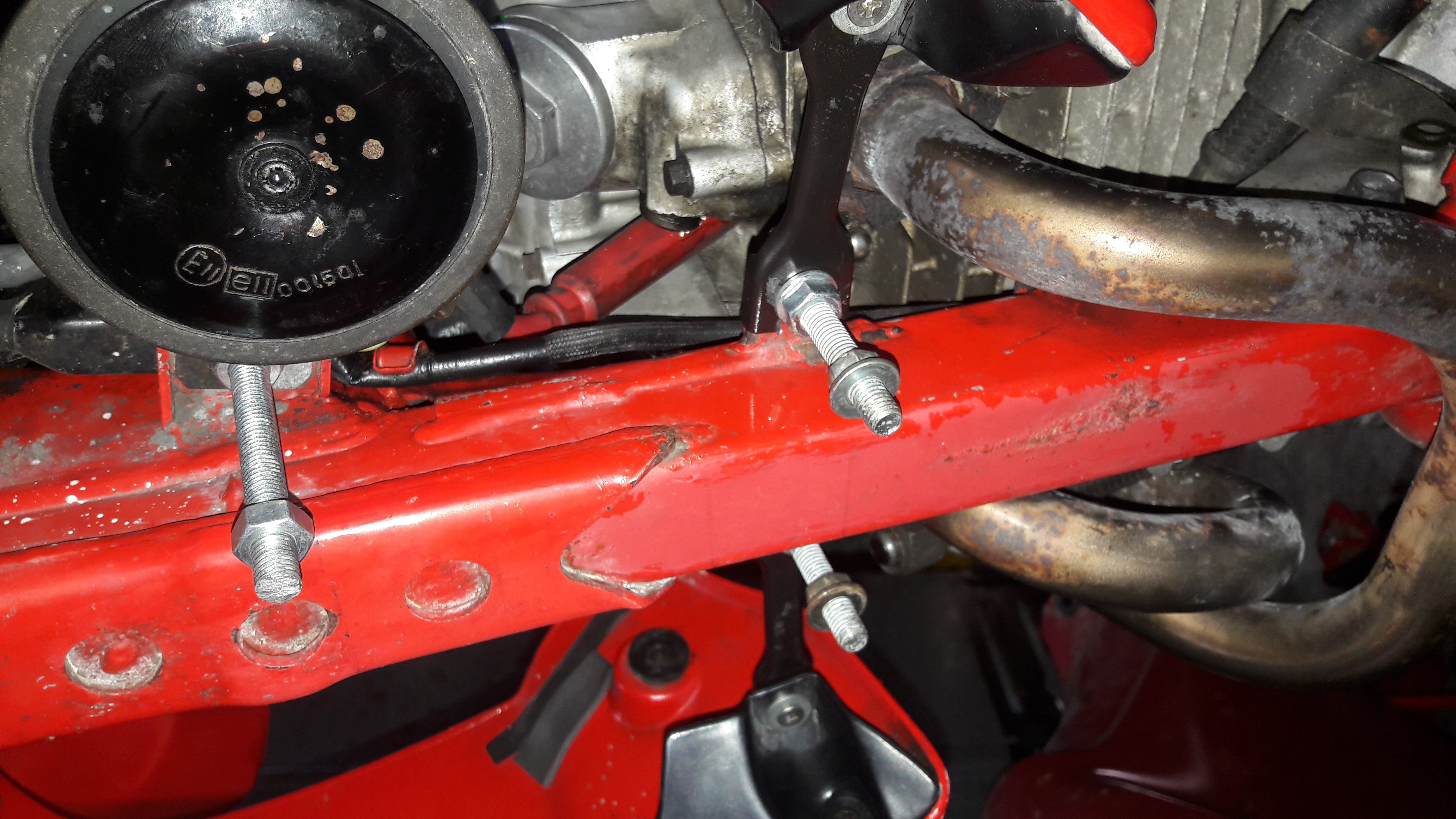 Hat original 2 montagelaschen die an hupenhalterung und motorhalterung mittels zwischenstücken festgemacht sind