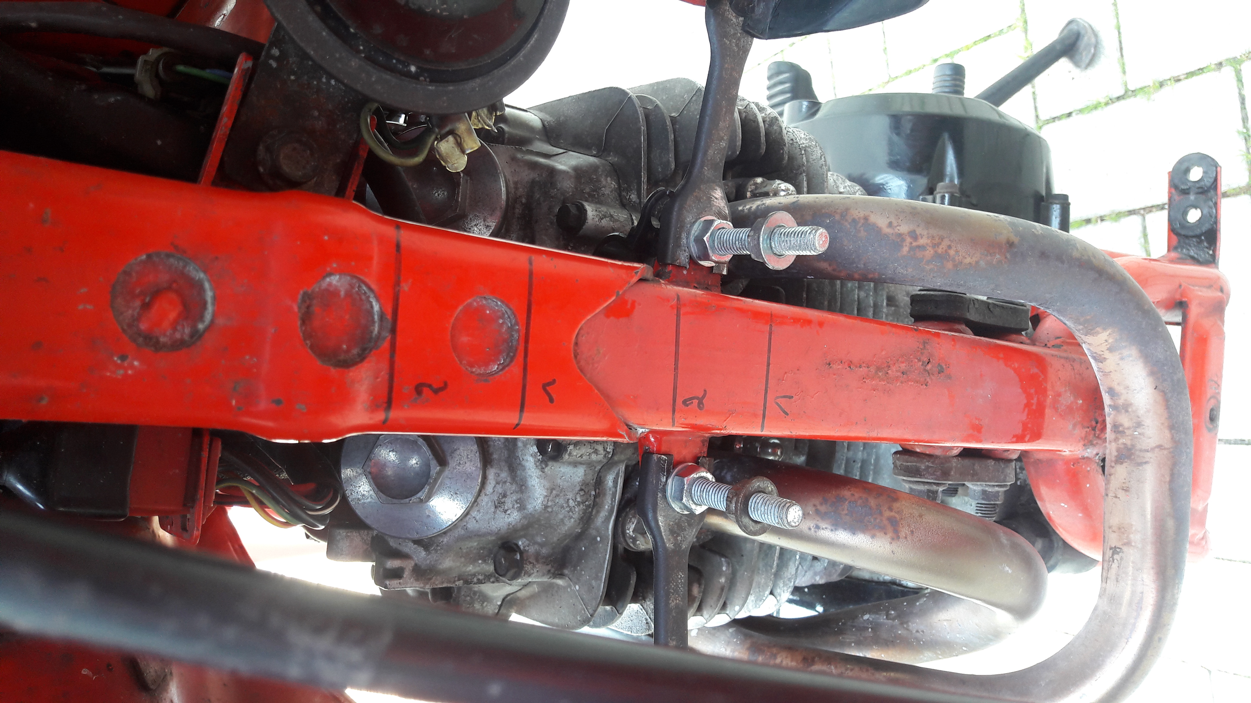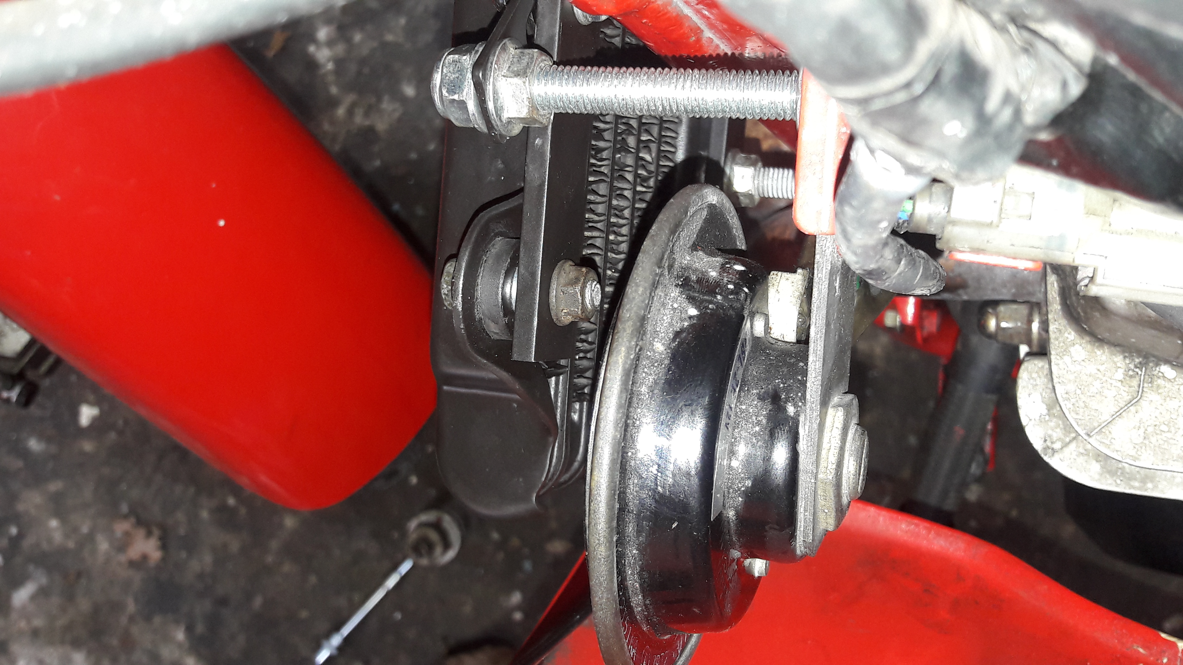 Hat original 2 montagelaschen die an hupenhalterung und motorhalterung mittels zwischenstücken festgemacht sind