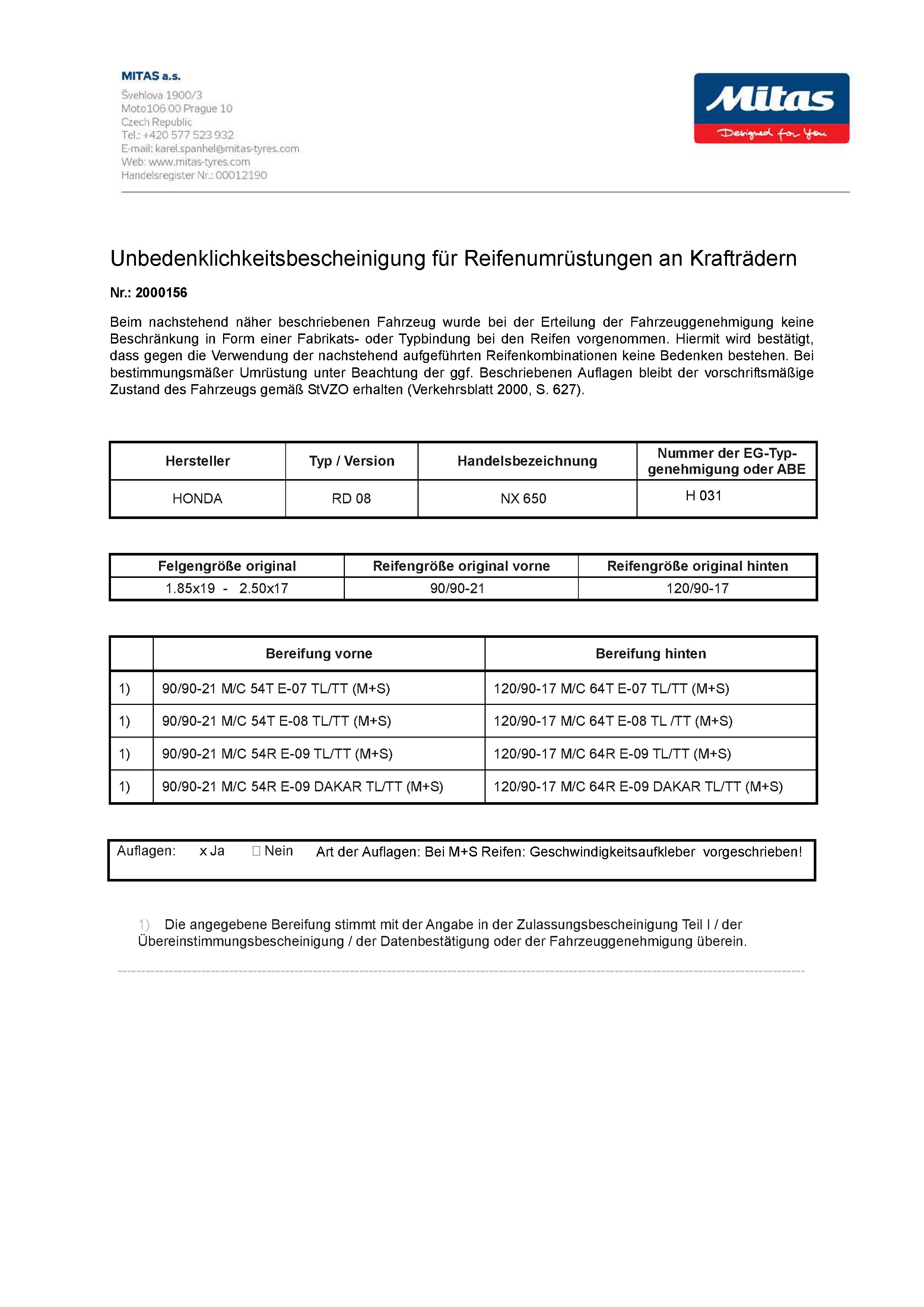Ich hatte jetzt zwei mal den Heidenau K60 drauf bei 80% Straße. Der Vorderreifen hielt bei mir gut 14000 km, der Hinterreifen ca. 7000 km. Ich finde den bei trockener und bei nasser Straße recht gut, solange hinten noch genug Profil drauf ist. Ab ca. 4000 km klebt er hinten nicht mehr so gut am Asphalt. Im Gelände hat er mich nicht überzeugt, besonders nicht am Vorderrad, das bricht gerne aus in der Kurve, kann aber auch an meiner ausbaufähigen Fahrtechnik liegen. Jetzt hab mal den Mitas E 07 bestellt. Die Freigabe für die RD08 hat mir Mitas auf Anfrage geschickt. Wollte sie als pdf oder doc anhängen, geht aber nur als jpg.