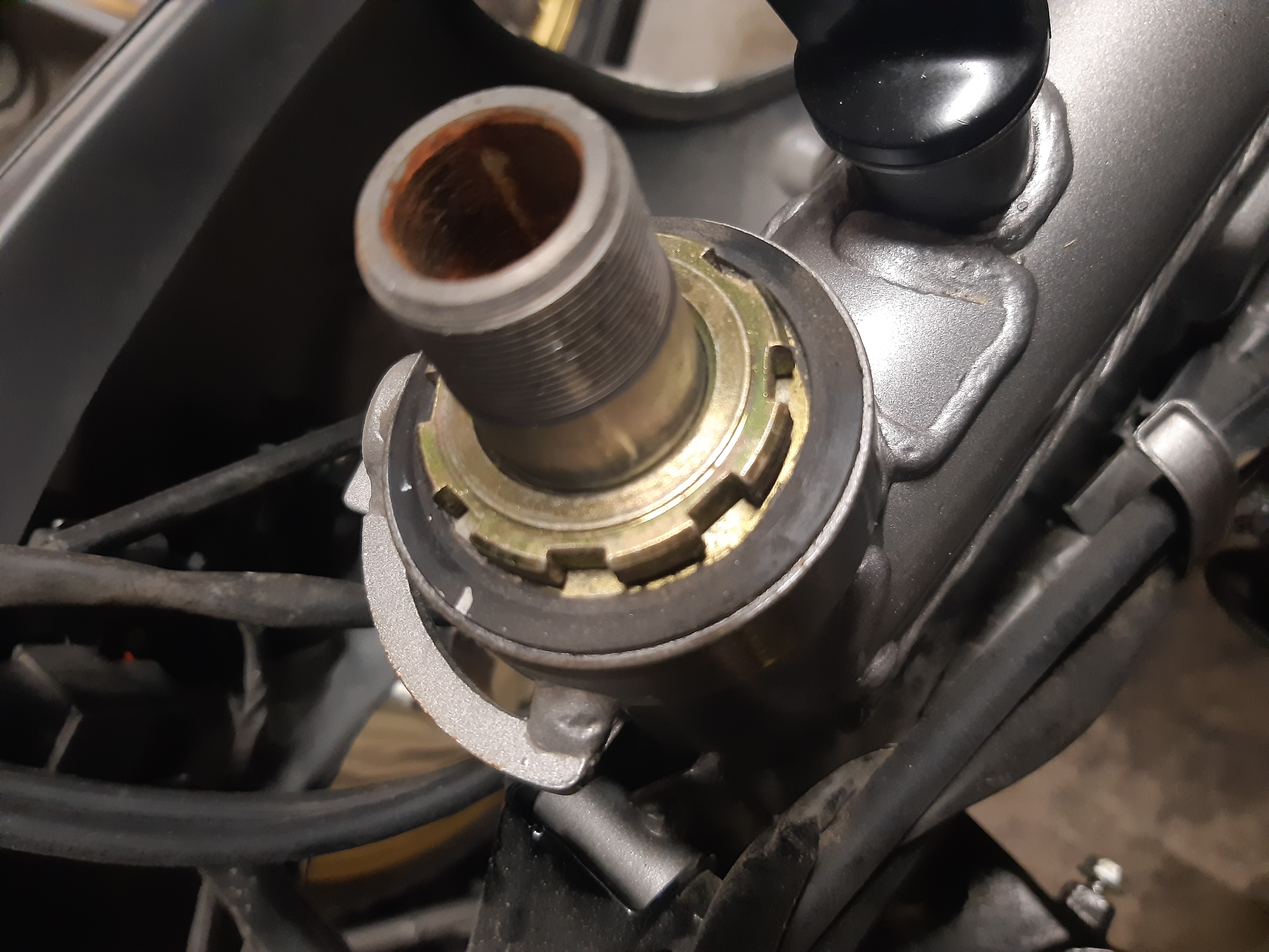 Meine Arbeit bis eben war das alte Lenkkopflager zu Demontieren. Die Lagerschalen möchten nicht aus sitz, dabei strengte sich die obere lagerschale mehr an als die untere. Sind aber jetzt draußen...