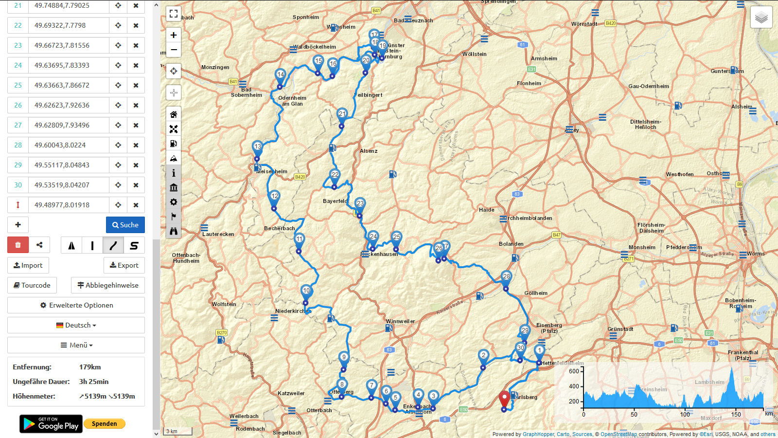 Hinweis: Punkt 10 und 19 müssen evtl. manuell hinzugefügt werden, je nachdem mit welchem Routenplaner die Datei geöffnet wird.