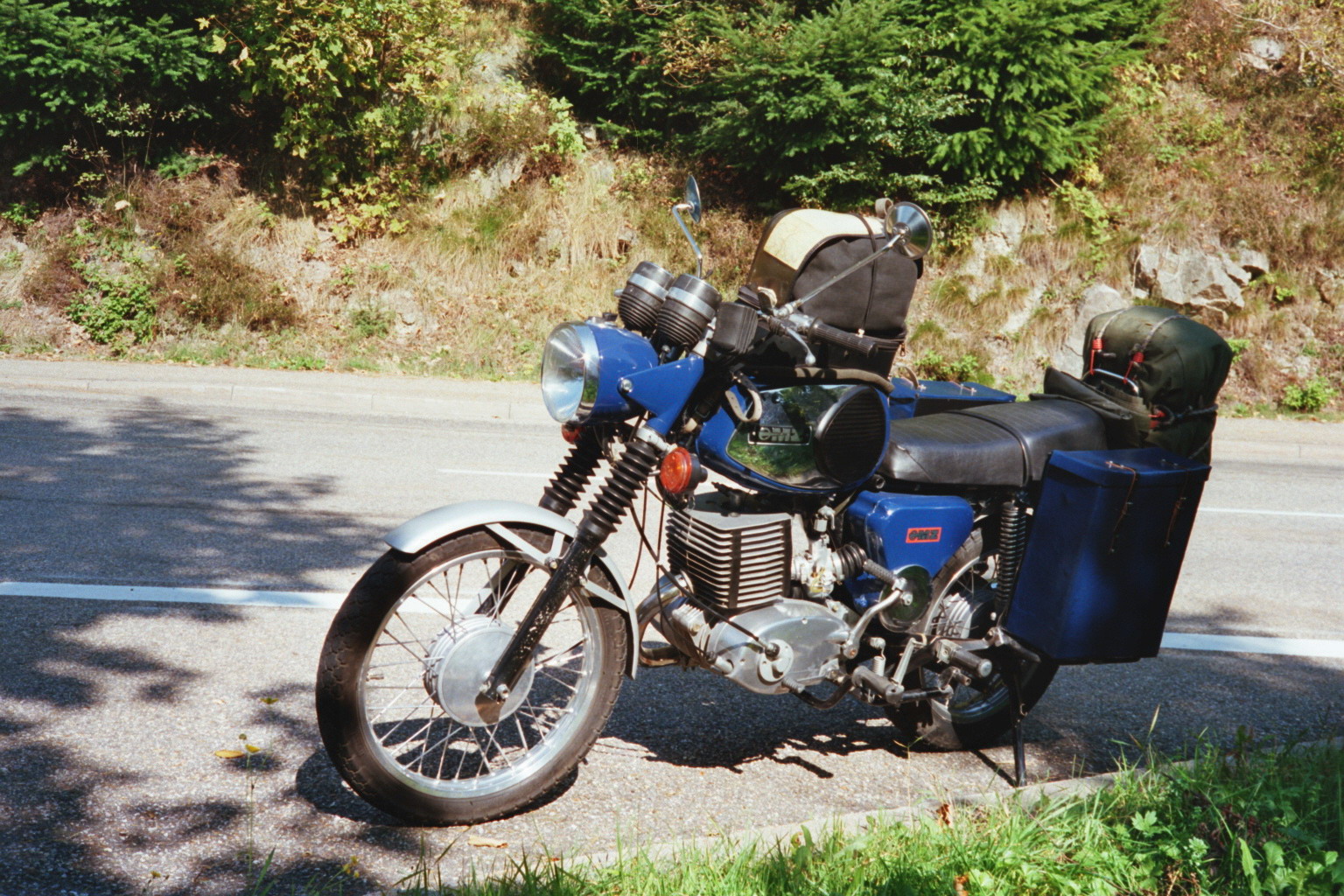 Am folgenden Tag hatte uns die Straße wieder. Ich versuchte verloren geglaubte Zeit einzuholen und begann konsequent Strecke zu machen. Dabei zeigten sich die Grenzen der Tourentauglichkeit – und zwar sowohl bei der TS als auch bei meiner Sozia. Grund war das rustikale Vierganggetriebe, das einen gewaltfreien Gangwechsel nur dann zuließ, wenn die Drehzahl zuvor auf Leerlaufniveau abgesunken war. Leider verlor die voll beladene Fuhre auf den kurvigen Gebirgssträßchen dadurch wieder so viel an Fahrt, dass sie im endlich eingelegten Gang schlicht zu verhungern drohte. Als Konsequenz daraus ergab sich ein verwegener Fahrstil, gegen den zwar die MZ kaum etwas einzuwenden hatte, dafür aber umso mehr der Magen meiner leidgeprüften Sozia. Jedenfalls sprachen die Geräusche, die aus den eilends aufgesuchten Büschen herüberklangen, eine eindeutige Sprache. Es dauerte mehr als zwei Stunden, bis sich die Gesichtsfarbe meines armen Weibes wieder normalisiert hatte und wir die Reise mit merklich gedämpfter Sportlichkeit fortsetzen konnten.