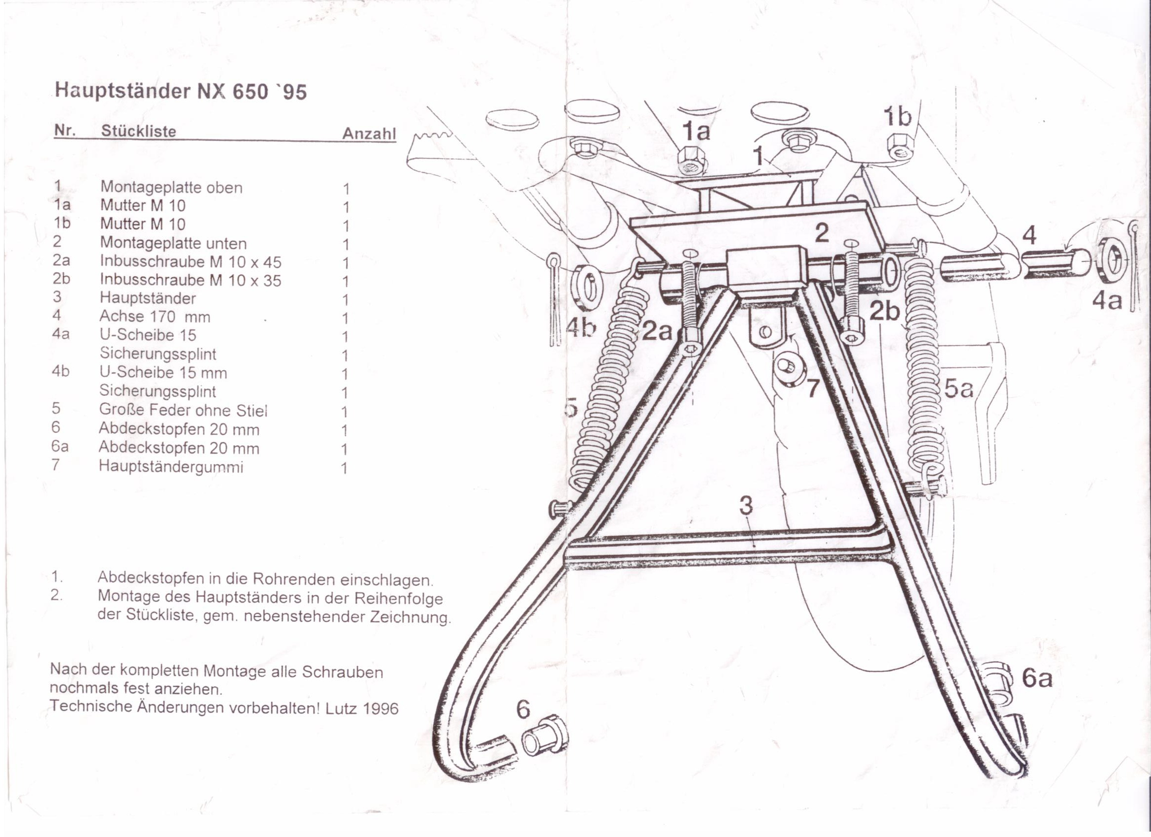 Ich habe einen Five-Stars-Ständer an meiner RD 08 EZ 1998. Das mitgelieferte TÜV-Gutachten stammt von 1996. Die Einbauanleitung nimmt aber Bezug auf die bis 1995 angebotenen Domi-Modelle. Nach dem Einbau stellte ich fest, dass die Maschine zwar mit viel Kraft aufgebockt werden muss, allerdings fast von allein wieder vom Hauptständer rollt. Mit Feilen habe ich den Anschlag so bearbeitet, dass das Runterrollen etwas schwerer geht. Vor dem Festzurren des Gepäcks sichere ich daher den Hauptständer mit einem Spanngurt. Weiteres siehe Bilder!