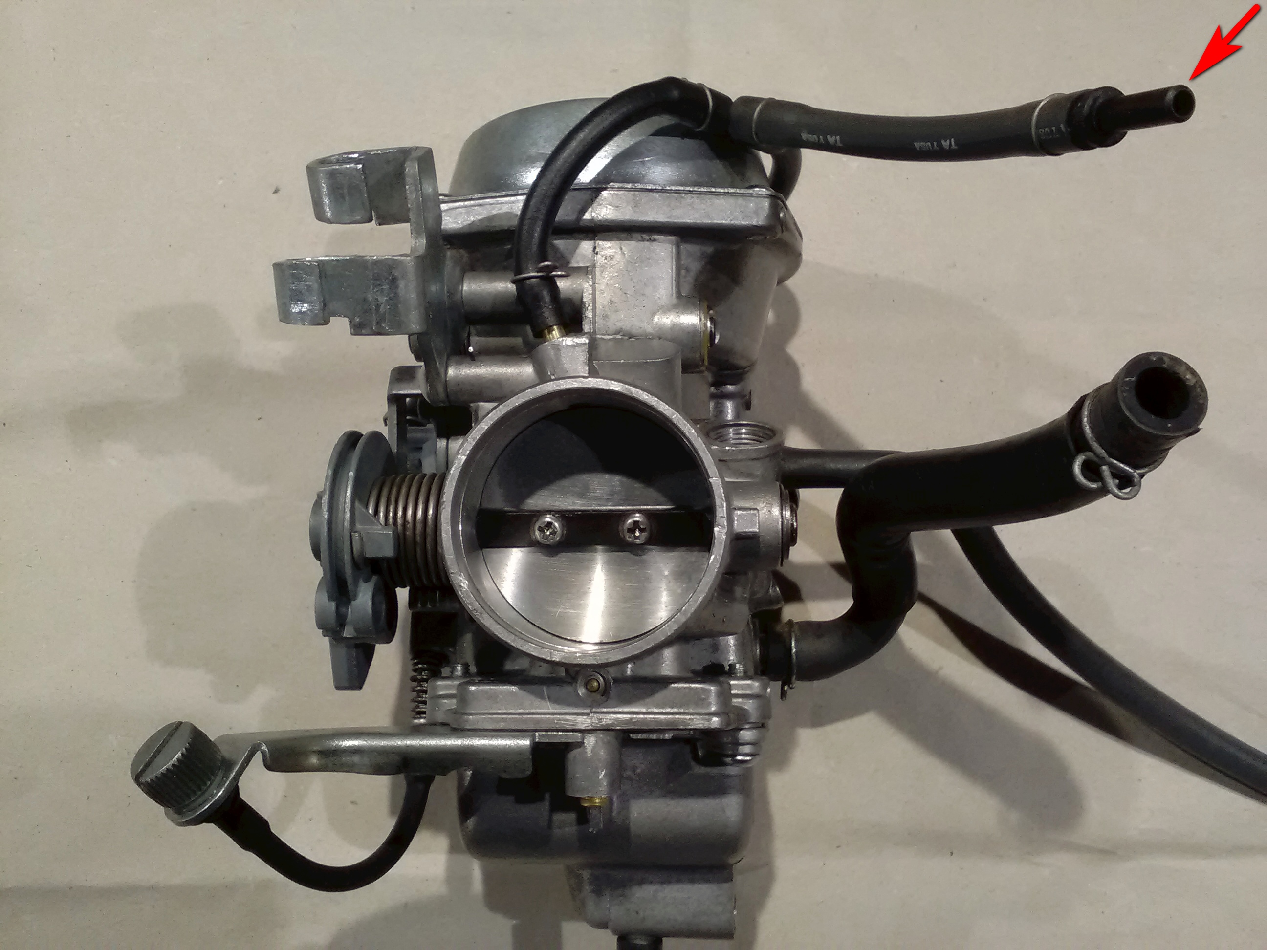Hallo und sorry, meine Doofheit hat vergessen Fotos zu machen und nun hab ich ein Problem mit den Schläuchen. Ich hatte das Moped (RD08 Bj.96) in der Werkstatt zum Vergaser reinigen und überholen, und der Mechanikus meinte "bau den mal aus, dann wird das billiger". Also hab ich den Vergaser ausgebaut und echt nicht aufgepasst und wie gesagt keine Fotos gemacht. Beim Einbau wusste der von der Werkstatt dann auch nichts mit den Schläuchen anzufangen. Beim Abgastest hat sich dann gezeigt, dass das T-Stück Luft zieht, woraufhin er das mit einem Blindstopfen verschlossen hat. Die Werte waren dann in Ordnung, aber so gehört sich das ja nicht. Das Bild ist vom Thread "Schlauchbelegung", das Foto ist von Die Cobra. Ich hoffe es ist ok, wenn ich das hier verwende. Ich hab den Anschluss mit einem Pfeil markiert, das zeigt bei meinem Vergaser Richtung Sattel. Was wird daran angeschlossen? Sorry nochmal, aber ich häng gerade in der Luft damit. Ich hab dann zwar noch einen freien Schlauch übrig, aber ich versuch erst mal ob ich anhand der Fotos im Forum selbst herausfinde wo der hin kommt.