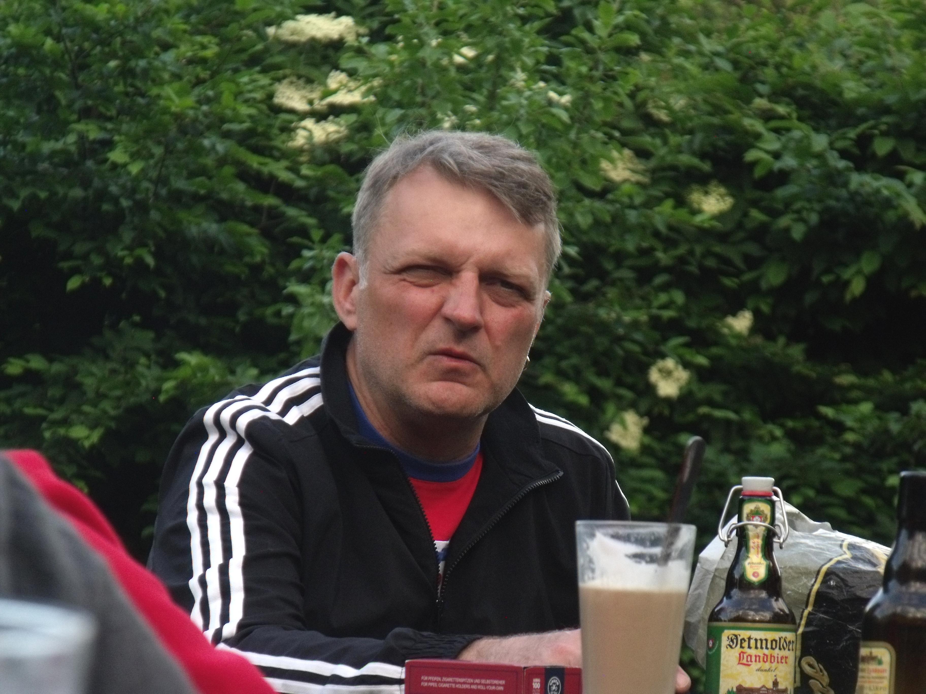 Das sind Ute (utechrissy) und ihr Partner Holger. Ute faehrt eine weiß-blaue Rd02, Holger eine GS. Die hier Wolfgang ist im Forum stiller mitleser und fährt GS. Ist aber Utes Privatschrauber, der ihre Domi nach 20 Jahren Dornröschenschlaf wieder fit gemacht hat und seit dem immer mit muss. MichaK aus Heimbach ist wieder Domi Fahrer. Das ist Micha weiße RD02 mit der Köln aufm Deckel Ute (Sauce Hollandaise) ist seit letzten Jahr im Forum und Wohnt im Niederländischen Friesland. Hier noch Utes Domi Das hier ist Raimund (staedigschrott), der aus Plön angereist war. Raimund war mit einem Freund aus Hamburg da. Das ist der junge Mann der versucht sein Bier durch die Maske zu trinken. Den Namen habe ich vergessen. Und das ist Raimunds Domi.
