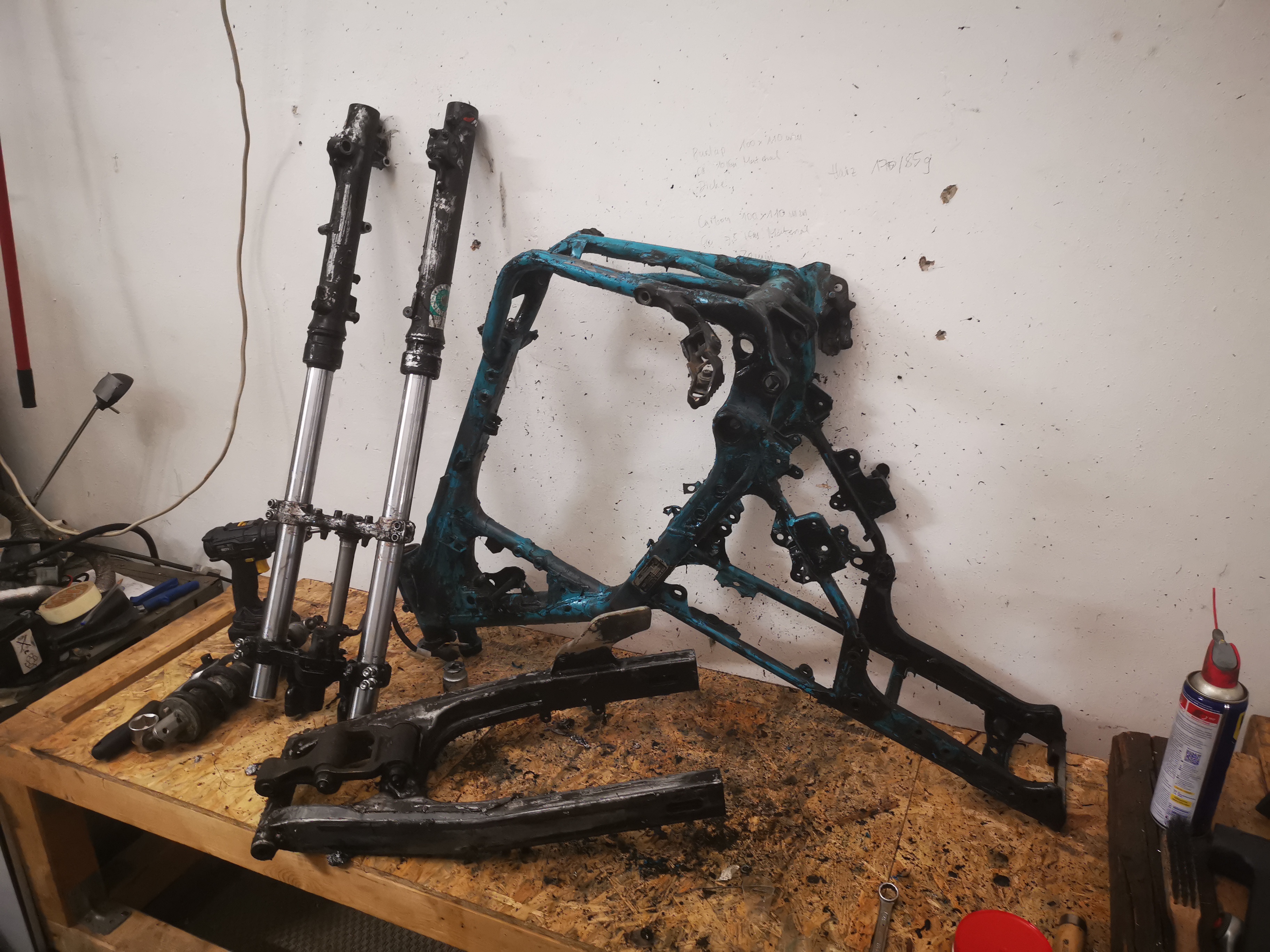 Also habe ich am Freitag mal begonnen, die Kiste zu zerlegen, alles feinsäuberlich nach Baugruppe zu verpacken und Rahmen, Schwinge und Gabel zu entlacken (habe hier bereits beste Erfahrungen mit dem Adler Express-Abbeizer gemacht).