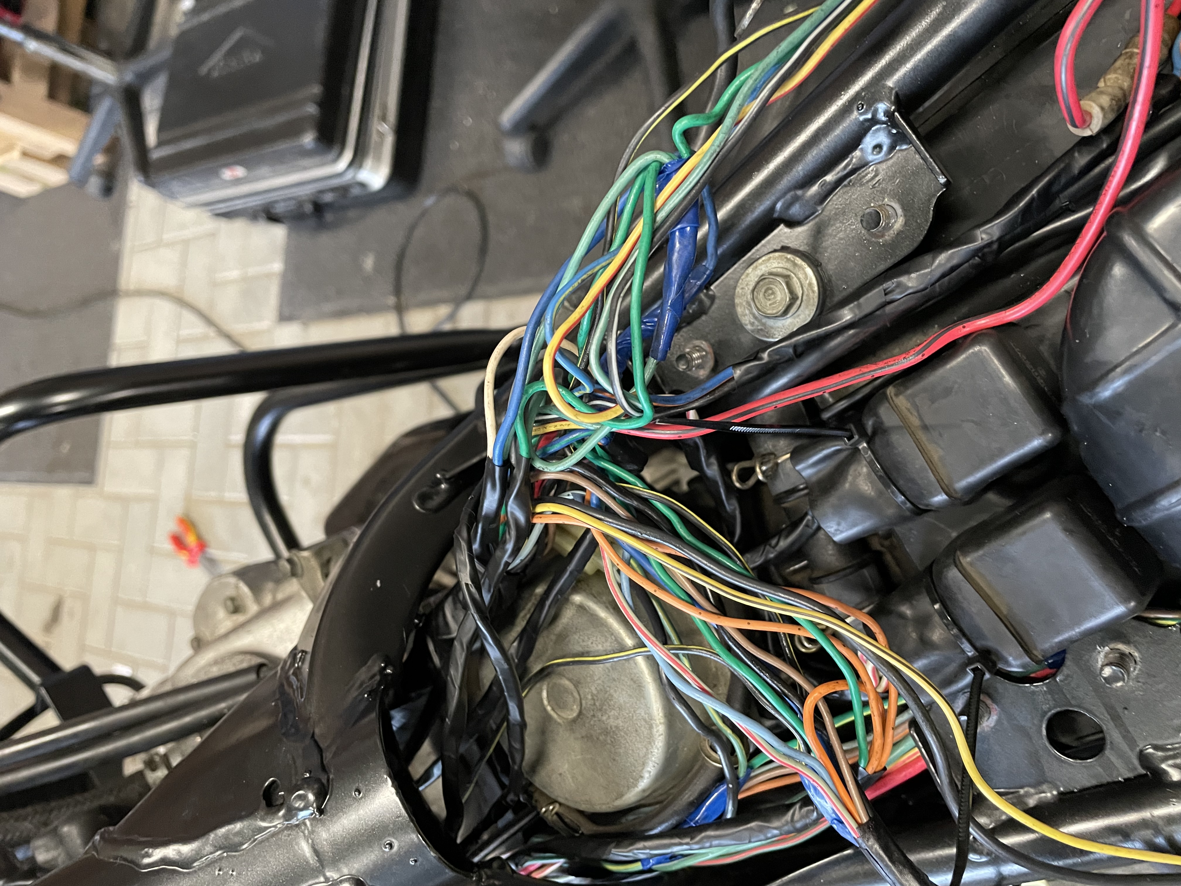 Fusebox findet seinen Platz auch unter der Sitzbank, die Relais kommen unter die Tank Halterung. Das Blinker Relais habe ich unter dem Tank verstaut.