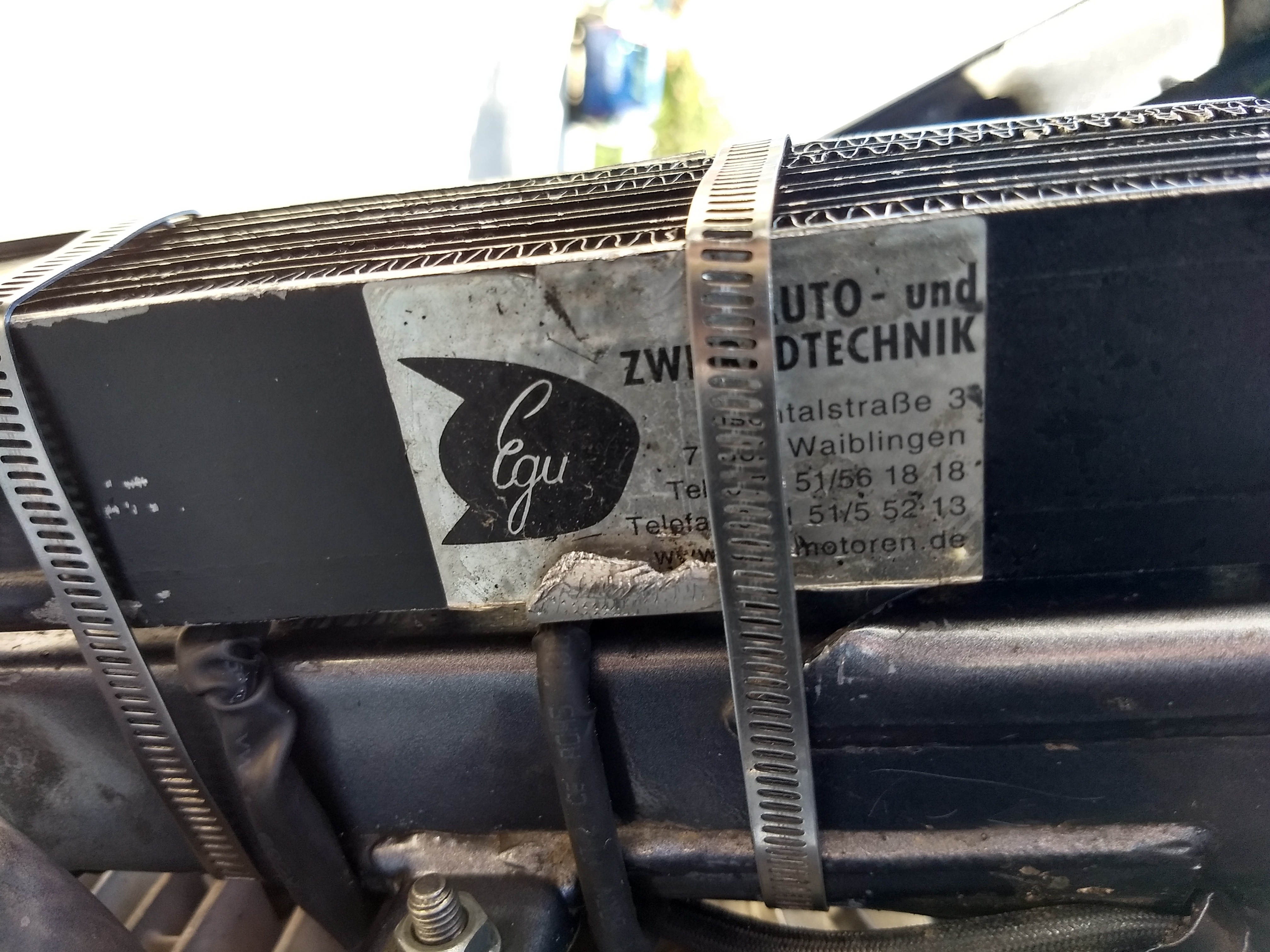 Hab es jetzt gesehen dass der Kühler von Egu ist, der Aufkleber auf der Rückseite war schwarz lackiert, siehe Foto. Ein neuer Anschluss ist oben drauf, heute bei der Hydr.firma besorgt. Unten ging es nicht wegen dem Abstand zum Krümmer. Den alten mit Dirko HT an den Hartlötstellen eingeschmiert und tatsächlich hab ich eine kleine undichte Stelle gefunden. Hab nochmal nachträglich eine dünne Schicht drauf, jetzt schau ich mir das nach der Heimfahrt heute Abend an.