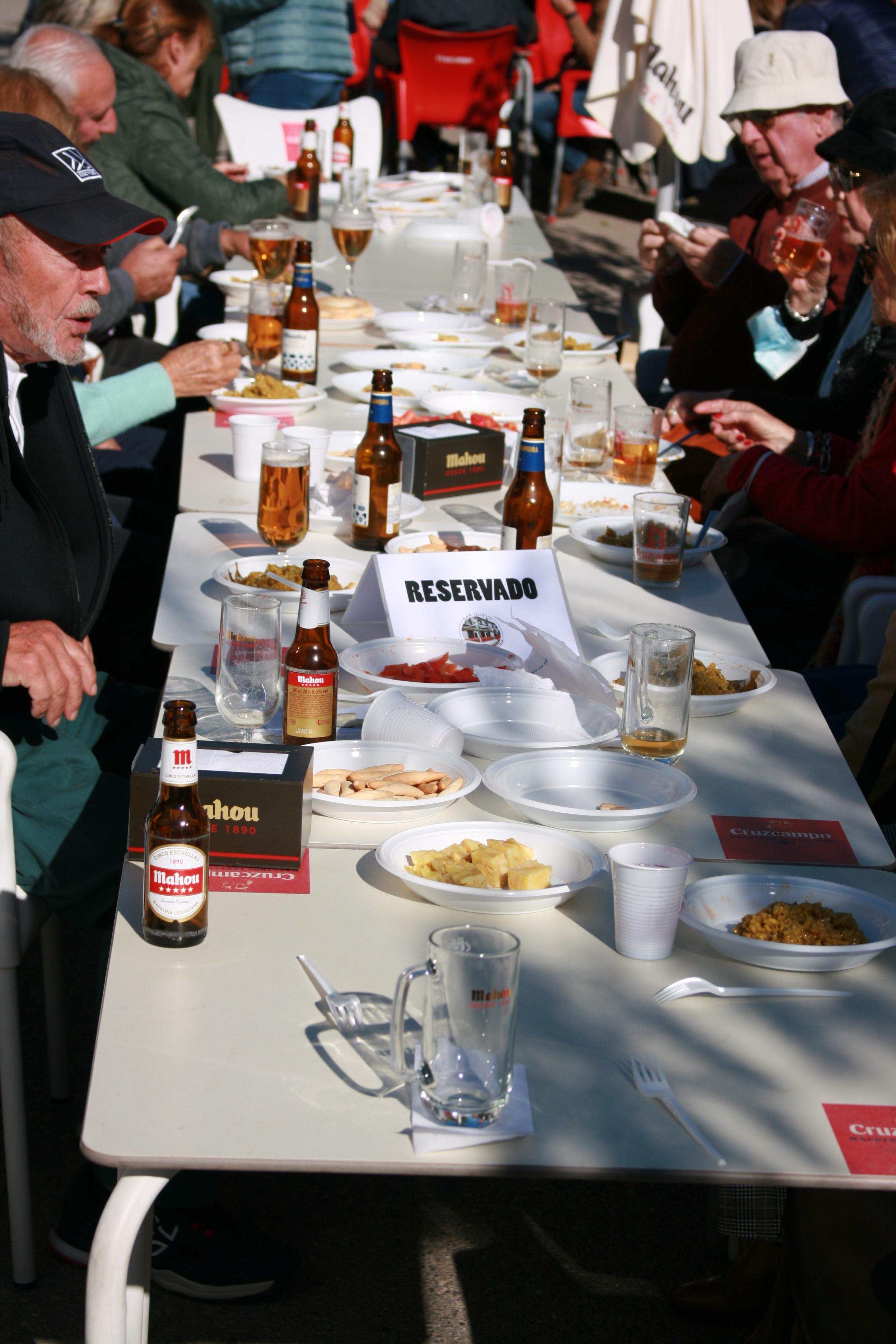 Aber egal, es war Fiesta. Gestern morgen wurden alle Anwohner der Hauptstraße (5) gebeten ihre Autos (und Mopeds) irgendwo anders zu parken, da gegenüber der Bar von Pipi (also auf unserer Seite) mehr und länger Sonne ist. Autos weg und die Straße gesperrt und Manolo konnte seine Terrasse vor unserem Haus aufstellen. Vor dem Casino (oder was davon übrig ist) Bauten dann einige Bewohner ihre Gasringe und Paellas auf und fingen an zu kochen. Paella machen ist traditionell Männersache. Der Mythos ist, dass, in vergangenen Zeiten, wenn die Frau im Kindbett lag, der Mann kochen musste. Daher wohl auch der Name Paella, was von "para ella" (für sie) abgeleitet sein soll. Ein festes Rezept gibt es nicht und eigentlich ist jedes Reisgericht, das in einer Paella (die runde Pfanne aus Blaustahl heißt auch so) eine Paella. Ja, ja, ich weiß: Die einzige, echte Paella kommt aus Valencia und muss Erbsen, Langusten und Huhn beinhalten. Alles quatsch. Entscheidend ist, dass alles (auch der Reis) zusammen in der einen Pfanne gekocht wird.