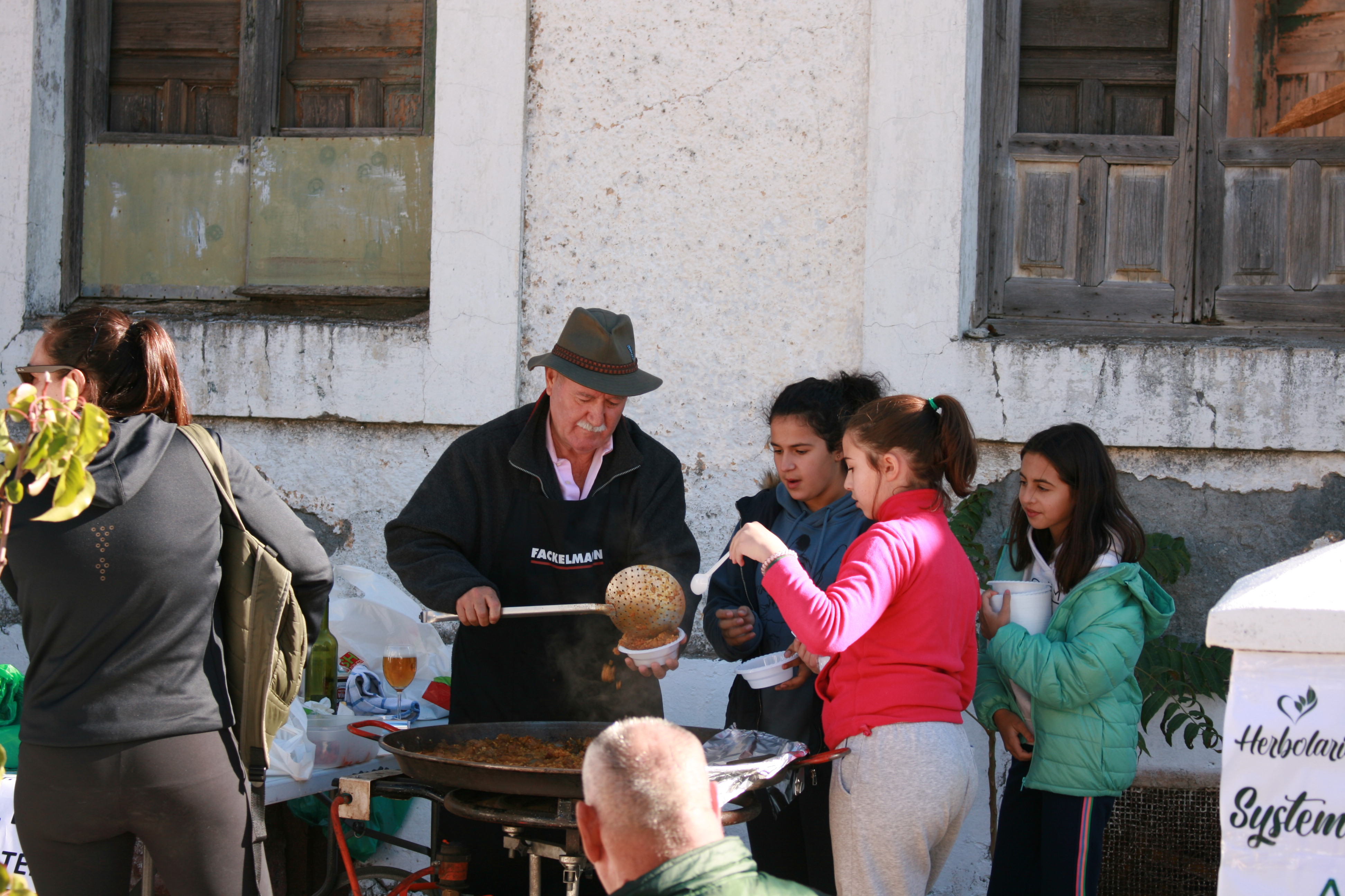 Aber egal, es war Fiesta. Gestern morgen wurden alle Anwohner der Hauptstraße (5) gebeten ihre Autos (und Mopeds) irgendwo anders zu parken, da gegenüber der Bar von Pipi (also auf unserer Seite) mehr und länger Sonne ist. Autos weg und die Straße gesperrt und Manolo konnte seine Terrasse vor unserem Haus aufstellen. Vor dem Casino (oder was davon übrig ist) Bauten dann einige Bewohner ihre Gasringe und Paellas auf und fingen an zu kochen. Paella machen ist traditionell Männersache. Der Mythos ist, dass, in vergangenen Zeiten, wenn die Frau im Kindbett lag, der Mann kochen musste. Daher wohl auch der Name Paella, was von "para ella" (für sie) abgeleitet sein soll. Ein festes Rezept gibt es nicht und eigentlich ist jedes Reisgericht, das in einer Paella (die runde Pfanne aus Blaustahl heißt auch so) eine Paella. Ja, ja, ich weiß: Die einzige, echte Paella kommt aus Valencia und muss Erbsen, Langusten und Huhn beinhalten. Alles quatsch. Entscheidend ist, dass alles (auch der Reis) zusammen in der einen Pfanne gekocht wird.