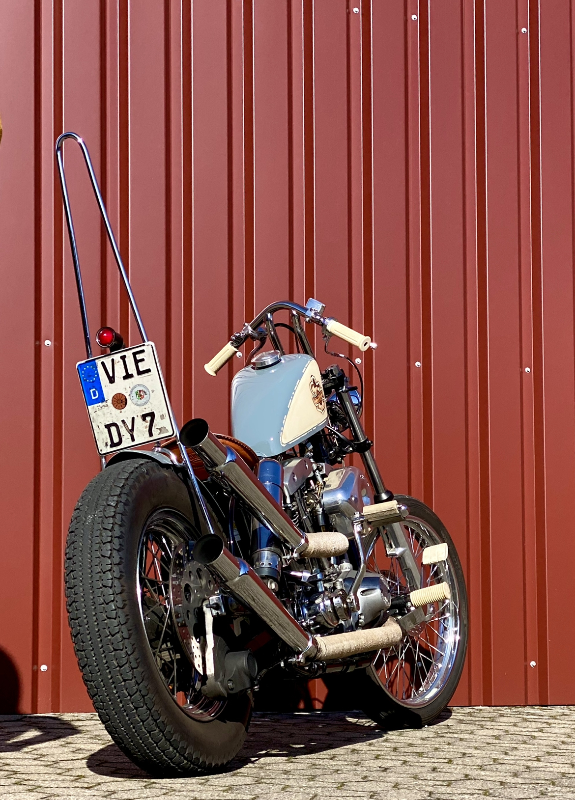 Auch sehr schöne Motorräder! Meine Shovel war vom Rahmen ein FLH. Ich habe sie damals in Kisten gekauft und einfach mal wild zusammengebaut, nach dem Motto "alles erlaubt was Spass macht". Die Gabel ist von einer FX da ich auf einen schlanken Vorderreifen gehen wollte. Am Ende hat sie auch noch TÜV bekommen ;-)