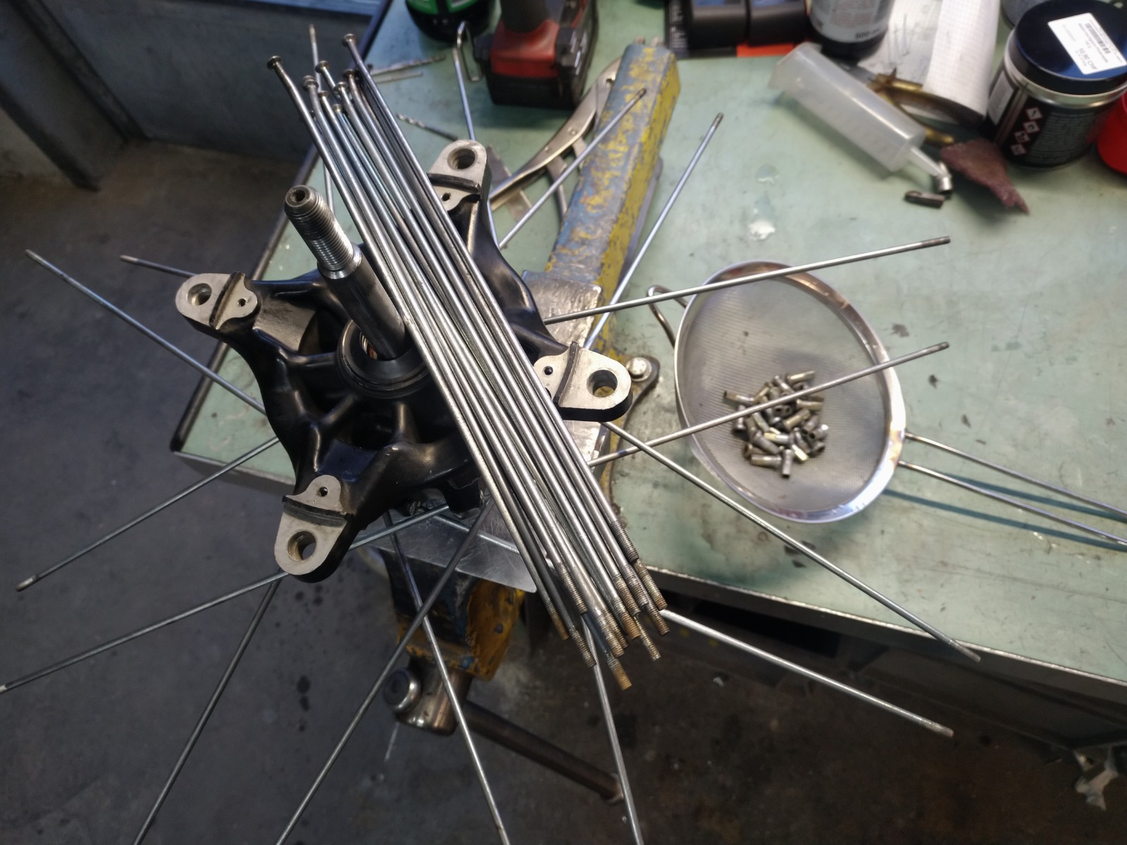 Nach dem Speichen einfädeln und grob alle Speichen gleichmässig auf Zug bringen, heisst es Zentrieren. Nun sieht das schon mal ganz gut aus. Die ganze Arbeit am Vorderrad hat mit Reinigung der Teile fast 6 Stunden gedauert. Tja, wärs nicht mein Hobby, wär's fast unbezahlbar. Damit wäre das Vorderrad jedoch überarbeitet. Anfang nächster Woche trudeln die neuen Gummis ein. Dann geht es dann auch schon mit dem Hinterrad weiter.