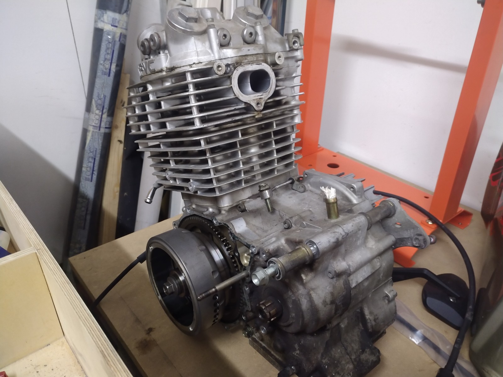 Wohin die Reise beim Aufbau dieser Domi gehen wird, steht noch nicht fest. Es liegt genug Material herum, um eine Enduro im XL600LM Look aufzubauen. Vielleicht setze ich aber auch den originalen Tank ein. Das werden wir später entscheiden. Zum Glück wurde am Rahmen kein Frevel begangen. Alles gesund. Zuerst werden aber alle Teile gesichtet und sortiert. Den Motor zerlege ich noch ein wenig, um zu sehen wie es um den Zylinderkopf steht.