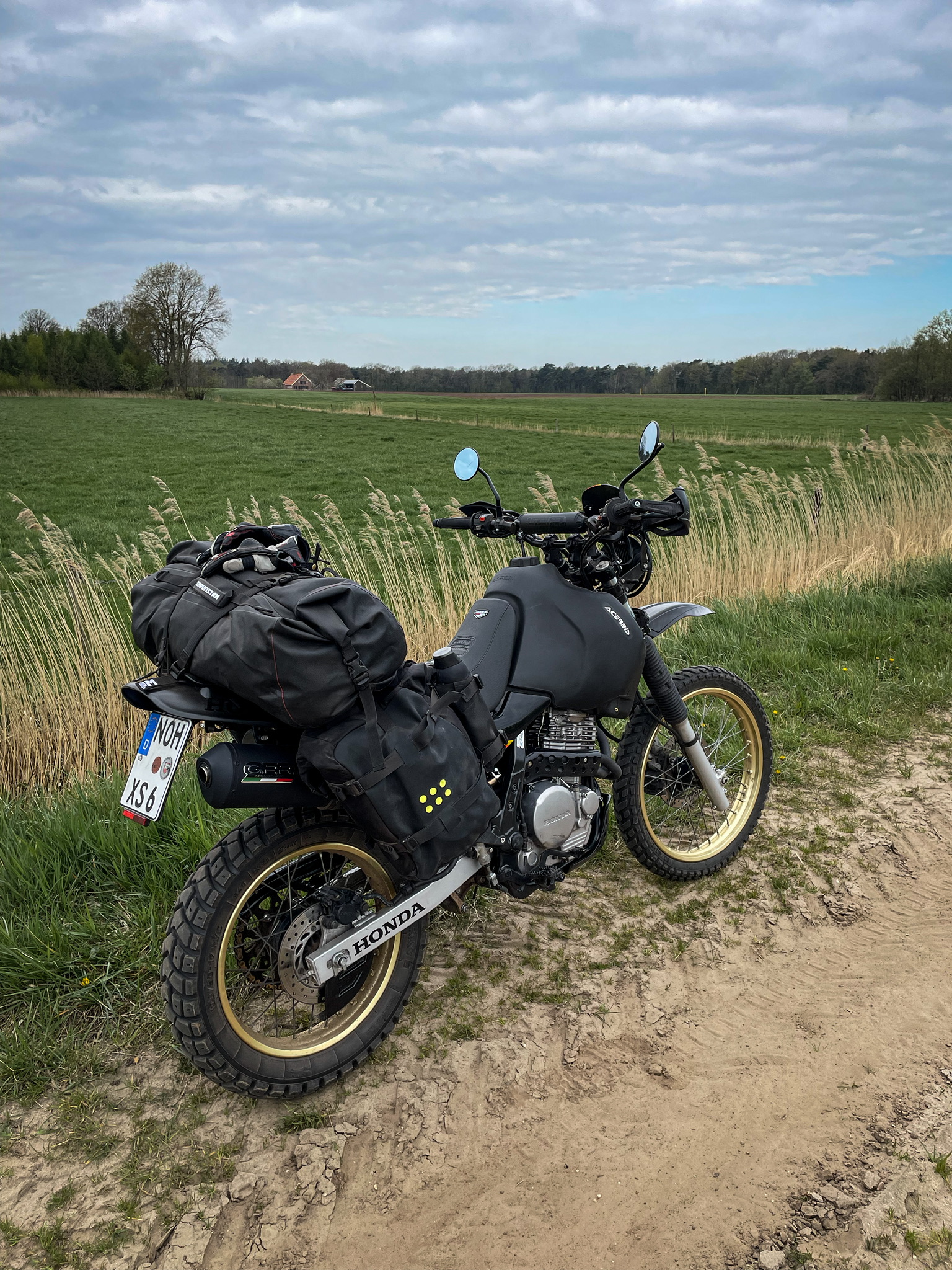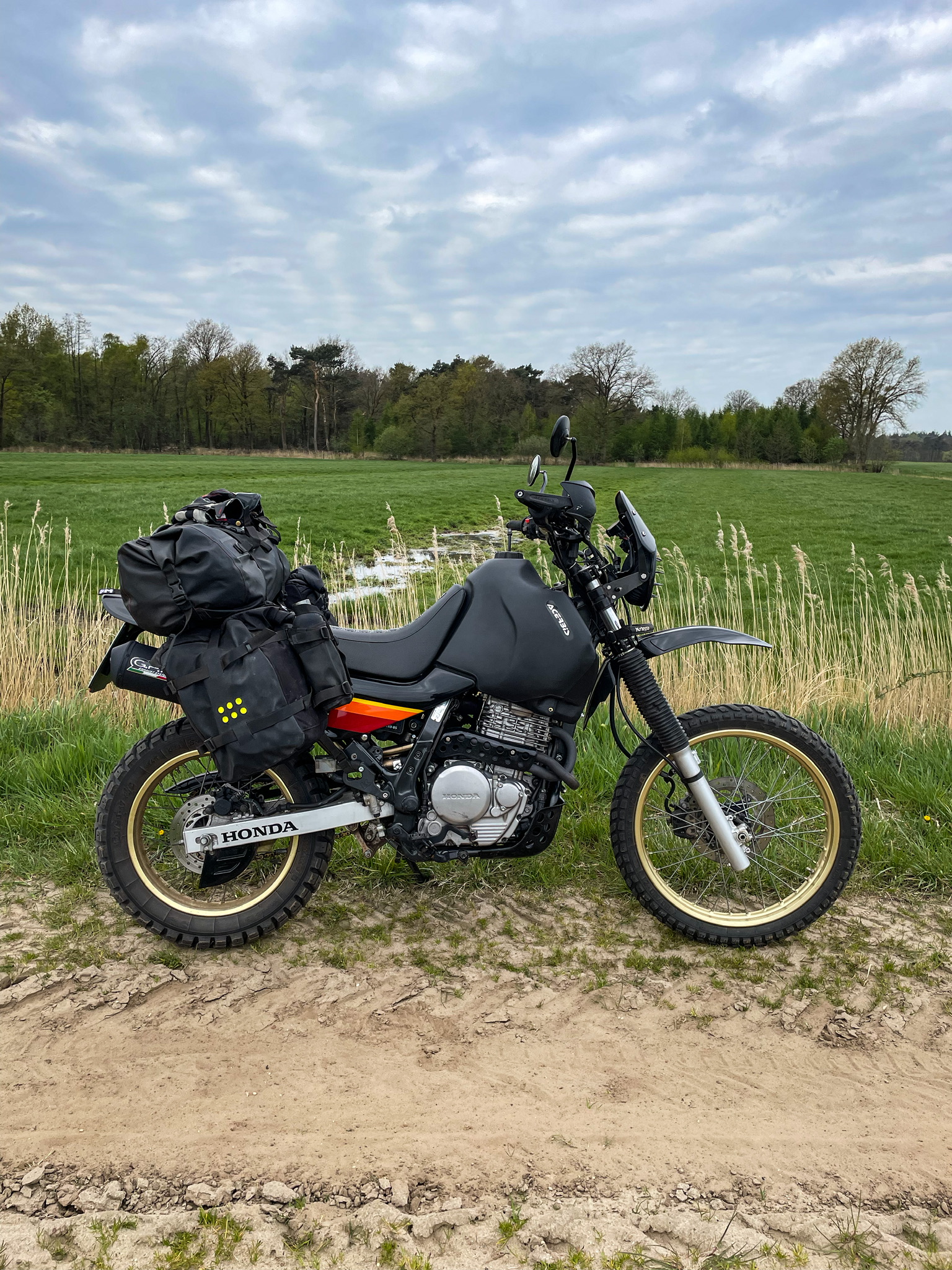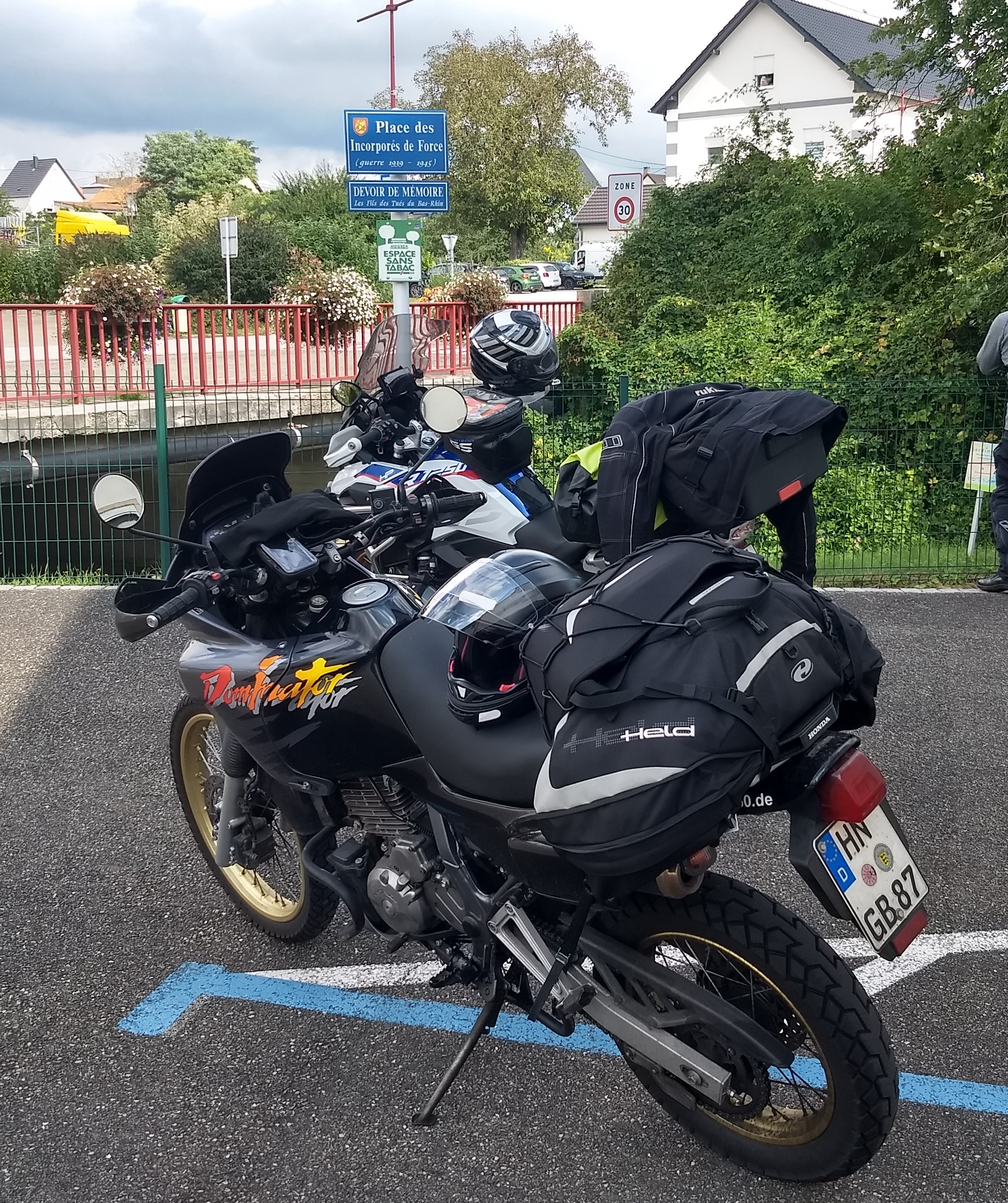 Madamme fuhr auf Dominator mit Topcase und wasserdichten Säcken. Ich bewegte meine Ladung auf der XL600R mit dem grossen Acerbis Tank. Wenn ich mich richtig erinnere hatte der ein Fassungsvermögen von 22 Liter.