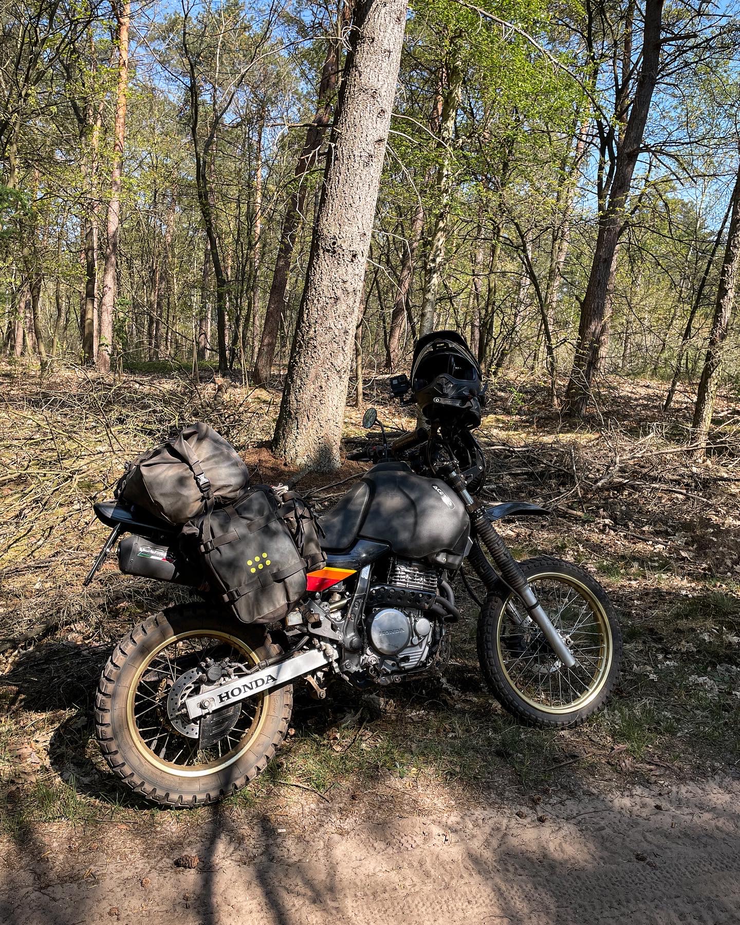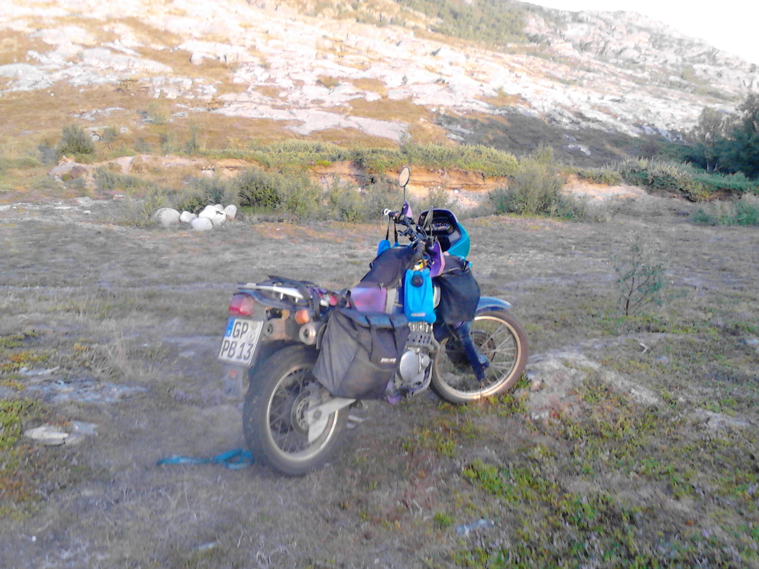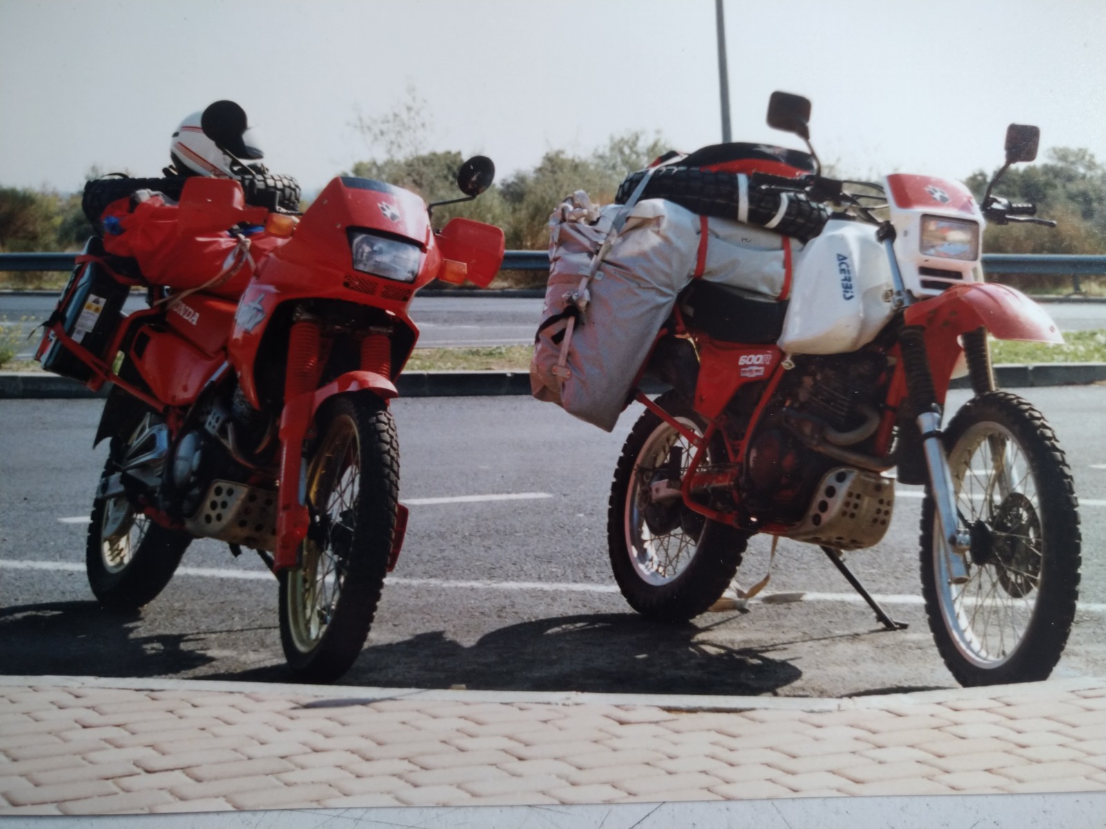 Madamme fuhr auf Dominator mit Topcase und wasserdichten Säcken. Ich bewegte meine Ladung auf der XL600R mit dem grossen Acerbis Tank. Wenn ich mich richtig erinnere hatte der ein Fassungsvermögen von 22 Liter.