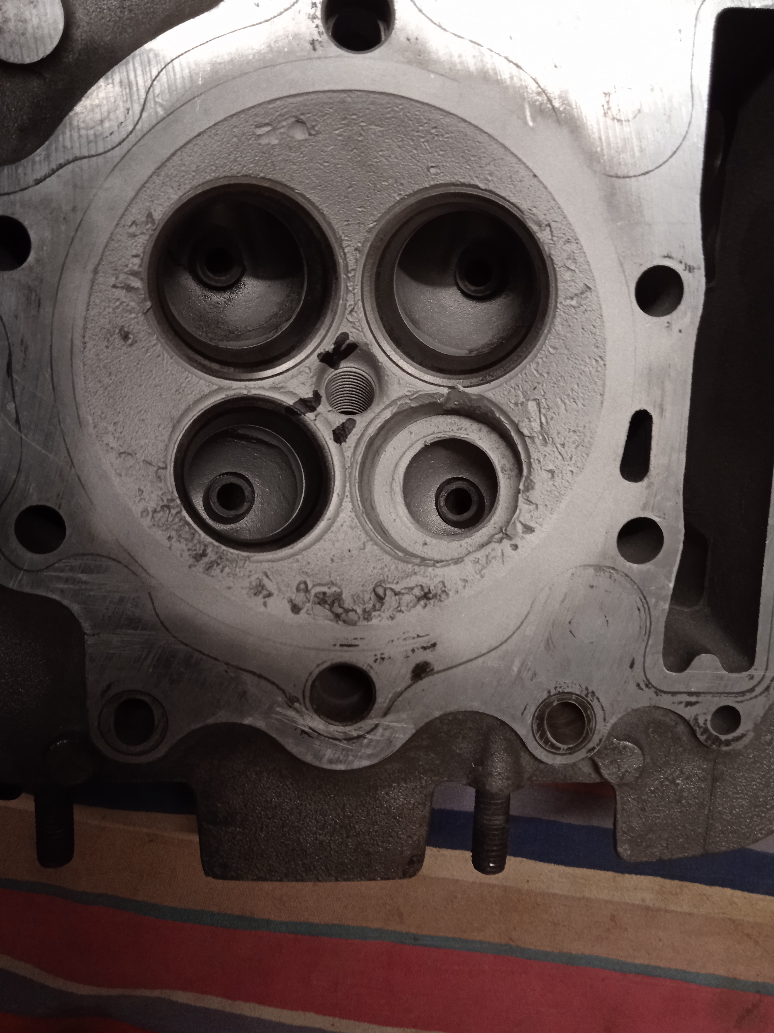 Das Kerzengewinde musste gestrahlt werden, um den Riss deutlich zu machen. Außerdem müsste da eh eine Buchse gesetzt werden, schließlich würde ja auch dort geschweißt. Und nach der Schweißerei würde ich auch den Kopf ganz leicht planen, um evtl. Verzug zu eliminieren. Das Strahlen war also schon richtig.