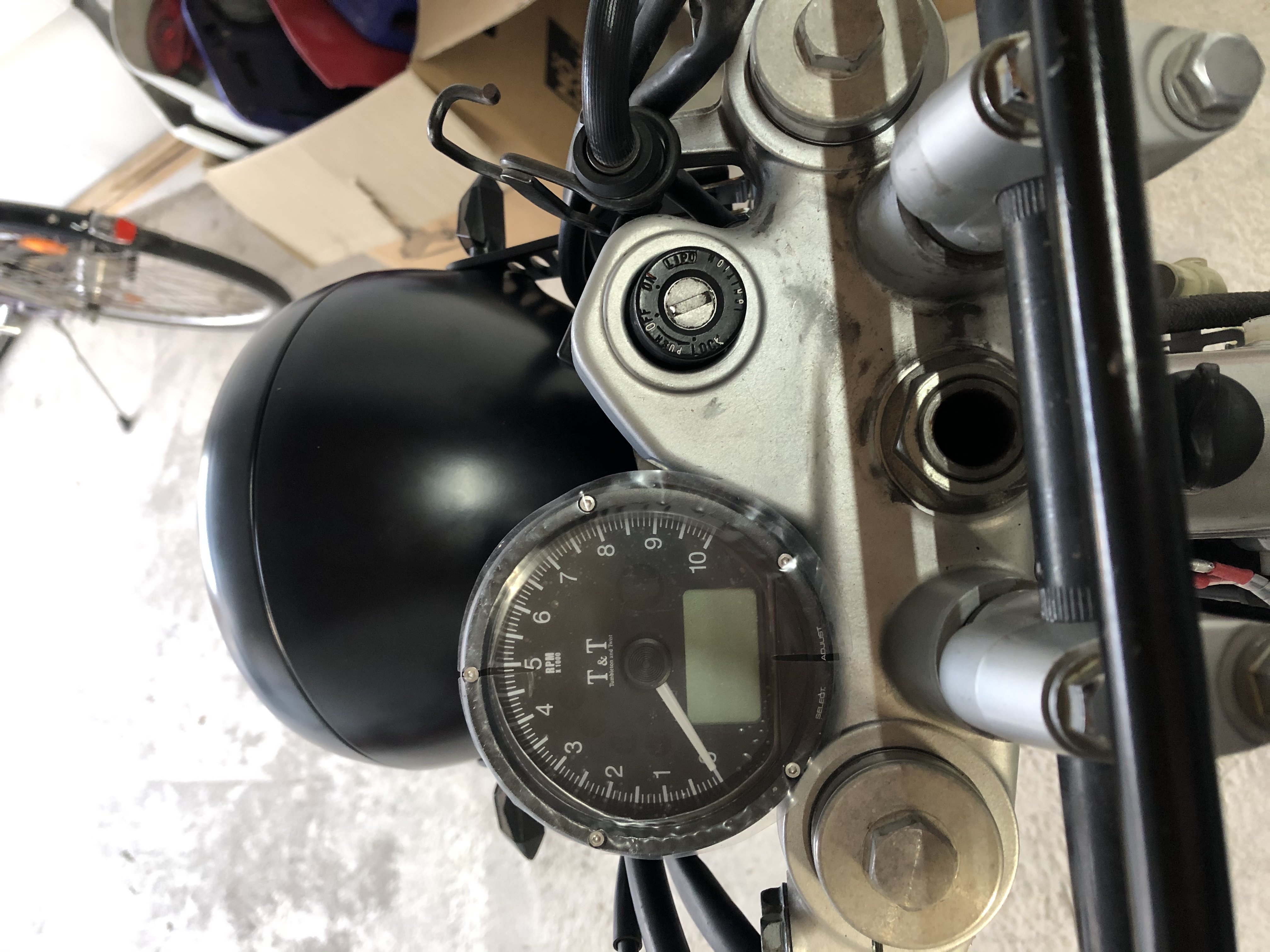 Ich wollte ebenfalls einen Digitaltacho an der originalen Gabelbrücke. Anbohren fiel wegen Tüv für mich weg, also habe ich eine Schraube des Zündschlosses rausgefriemelt (das war ätzend, aber soll ja auch so sein) und mir aus einem Stahlblech (ich glaube 1,5 mm Stärke) einen Streifen geschnitten und zurechtgebogen. Und zwar so, dass ich die eine Seite am Zündschloss und die andere an der Halterung meines Scheinwerfers festschrauben kann. Hier ein paar Bilder: