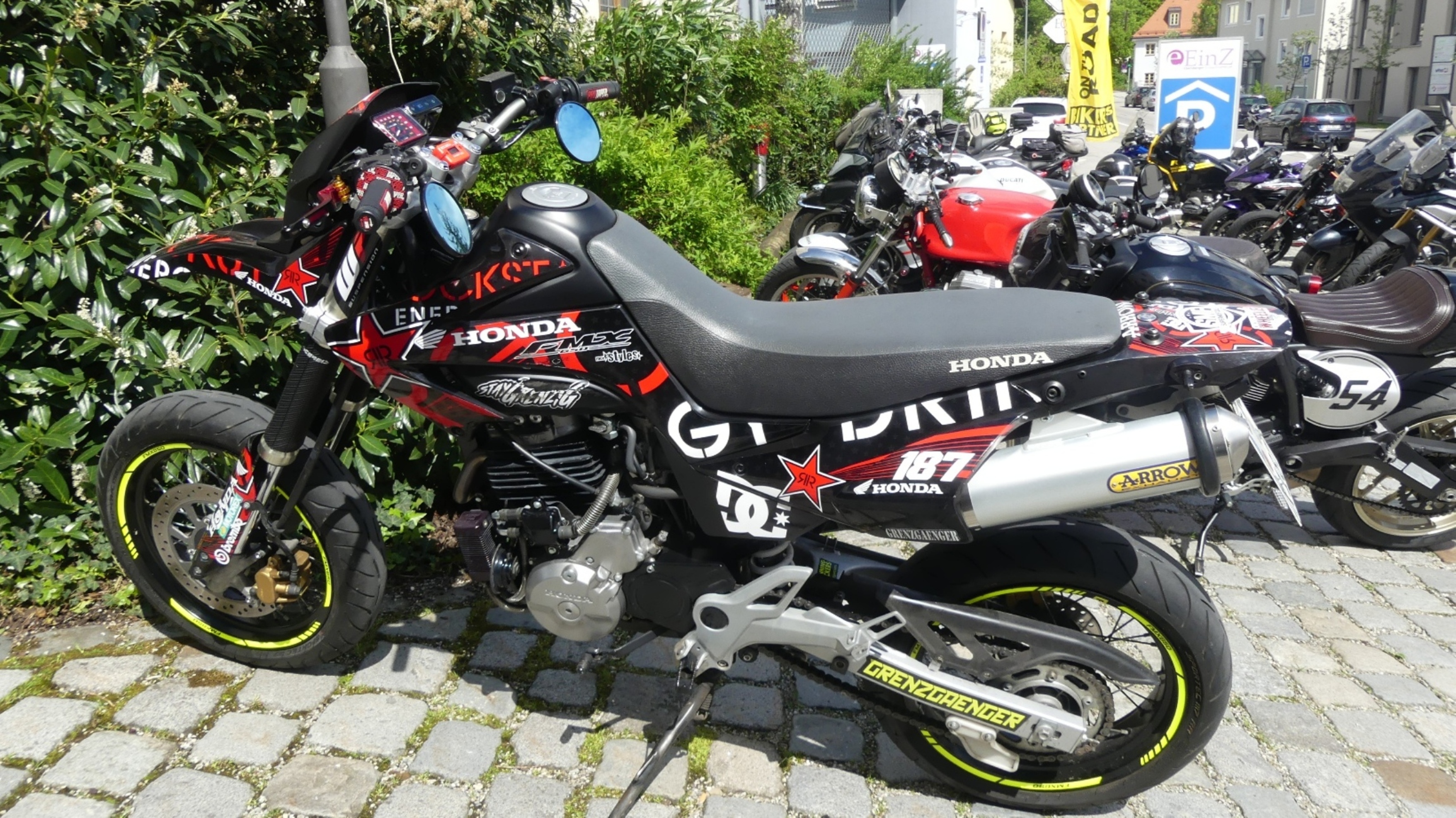 Keine Domis, aber Vorgängermodelle von Honda: Beim Maxlrainer Oldie Feeling an Fronleichnam mit knapp 5000 Oldtimern stand diese XL 600 L; habe ich lange keine mehr gesehen. Mit diesem Modell haben damals aus meinem Motorradclub Engstingen jeweils ein Pärchen mehrwöchige Touren durch Amerika und die Türkei unternommen, mit voller Campingausrüstung. Die meisten XT 500 Fahrer träumten von einem Tank wie die XL 500 S auf dem anderen Bild hat. Heute geht der Trend ja auch bei den Enduros wieder zur Orginalität, da war mir diese Maschine ein Bild fürs Archiv wert. Und dann lief mir gestern diese XR 600 R am Gaisberg bei Salzburg in der Fankurve beim Bergrennen über den Weg. Eine Winterbastlerei aus Garagen- und Kellerbeständen unter Verwendung einer XR 600 mit Yamaha XT 500-Tank, Louis-Zubehörauspuff, Vorderradfelge von der SLR und was halt da sonst noch rumlag.