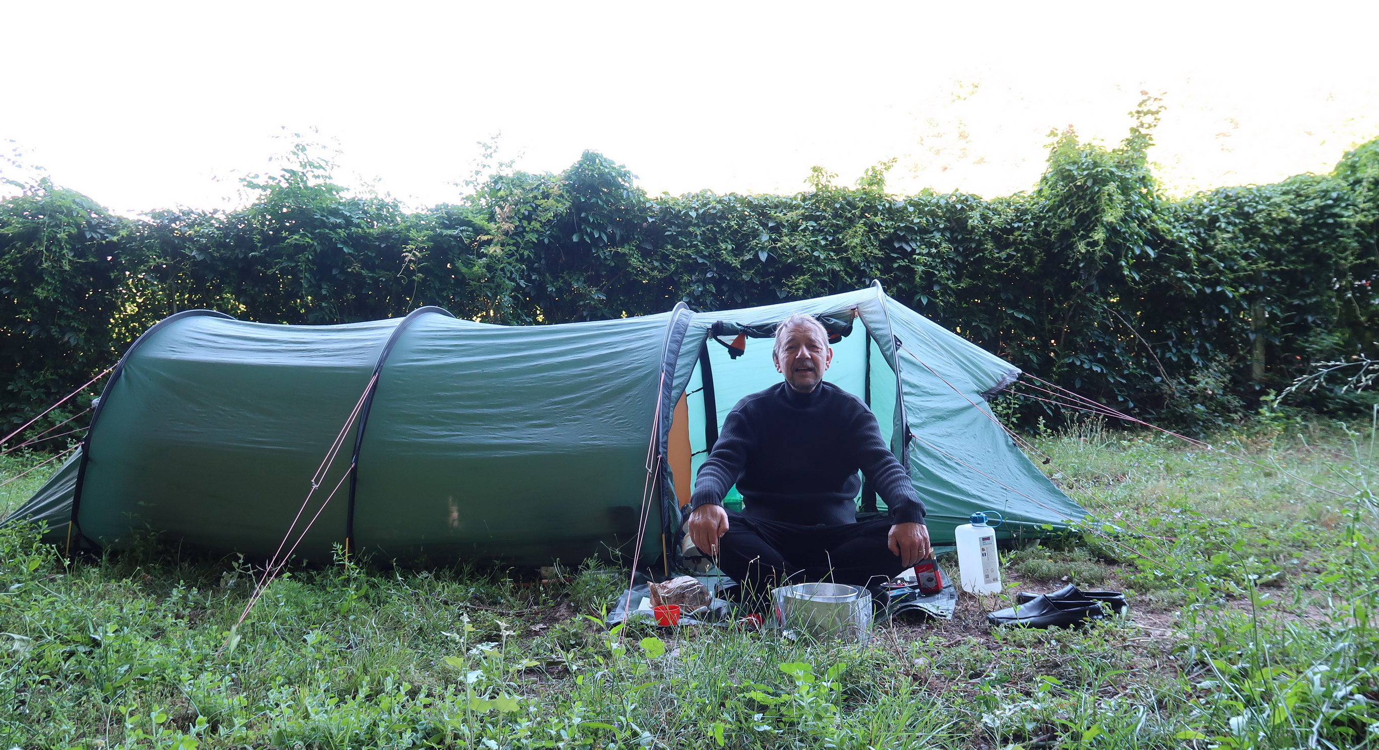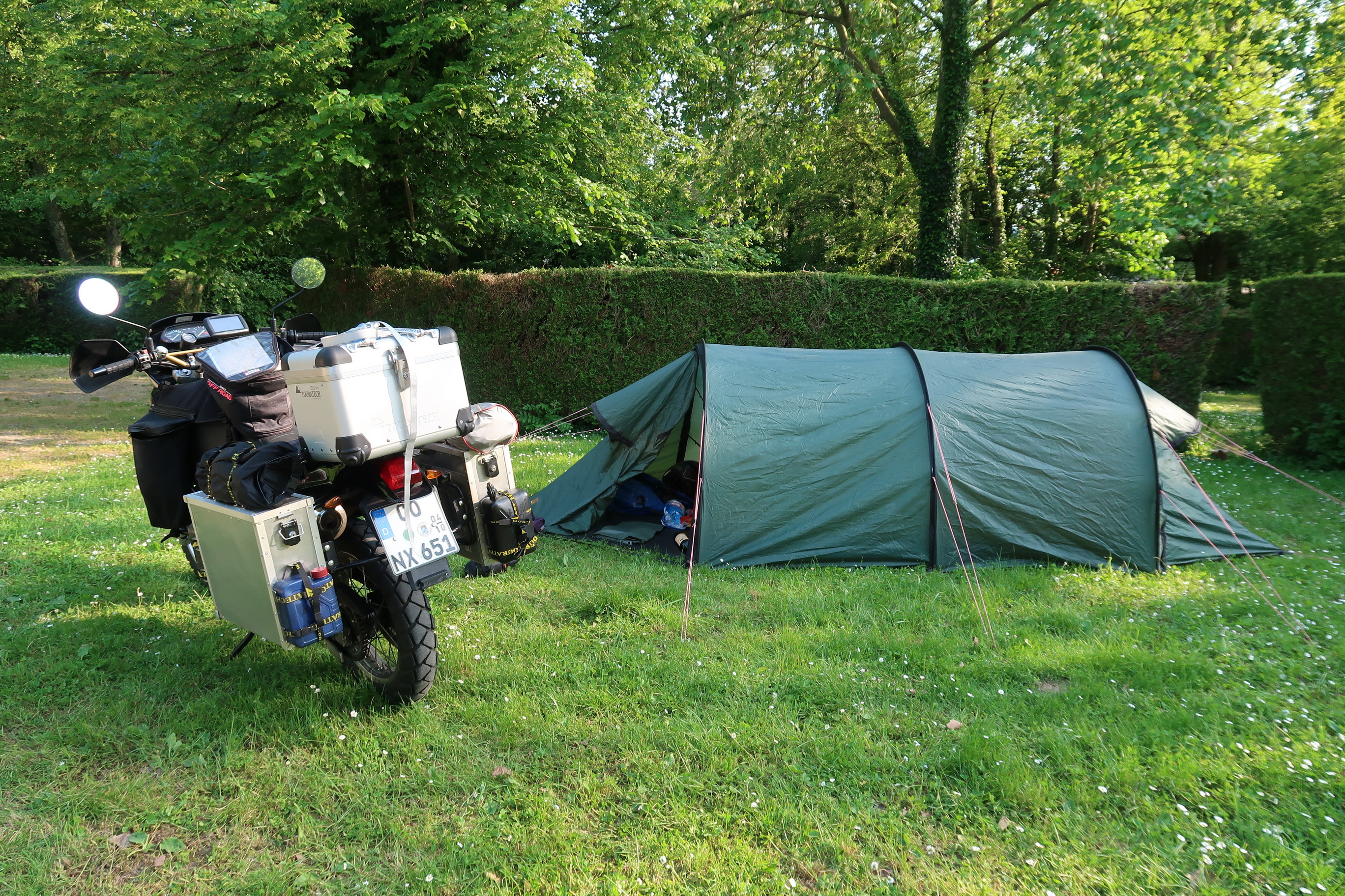 Nach 2.600 Anfahrts-Kilometern schlage ich auf dem Campingplatz auf. Eines ist klar: Das wird eine meiner längsten Reisen. Und ich fahre seit 1971 Motorrad. Mein Co2-Fußabdruck ist mittlerweile derart groß, dass ich mich 100 Jahre lang an einem Rembrandt-Bild festkleben müsste, um meine Schuld zu tilgen. Keine Chance, so alt werde ich nie! Eine geeignete Stelle zum Aufbau meiner Behausung zu finden, erweist sich als schwieriger als gedacht. Das Wäldchen steht dermaßen unter Wasser, dass ich an den Rand ausweichen muss. Da ich keine Ahnung über den Stand der Sonne habe, baue ich das Zelt so unglücklich auf, dass es ab 14 Uhr bis zum späten Abend in der prallen Sonne stehen wird. Aber noch ahne ich das nicht.