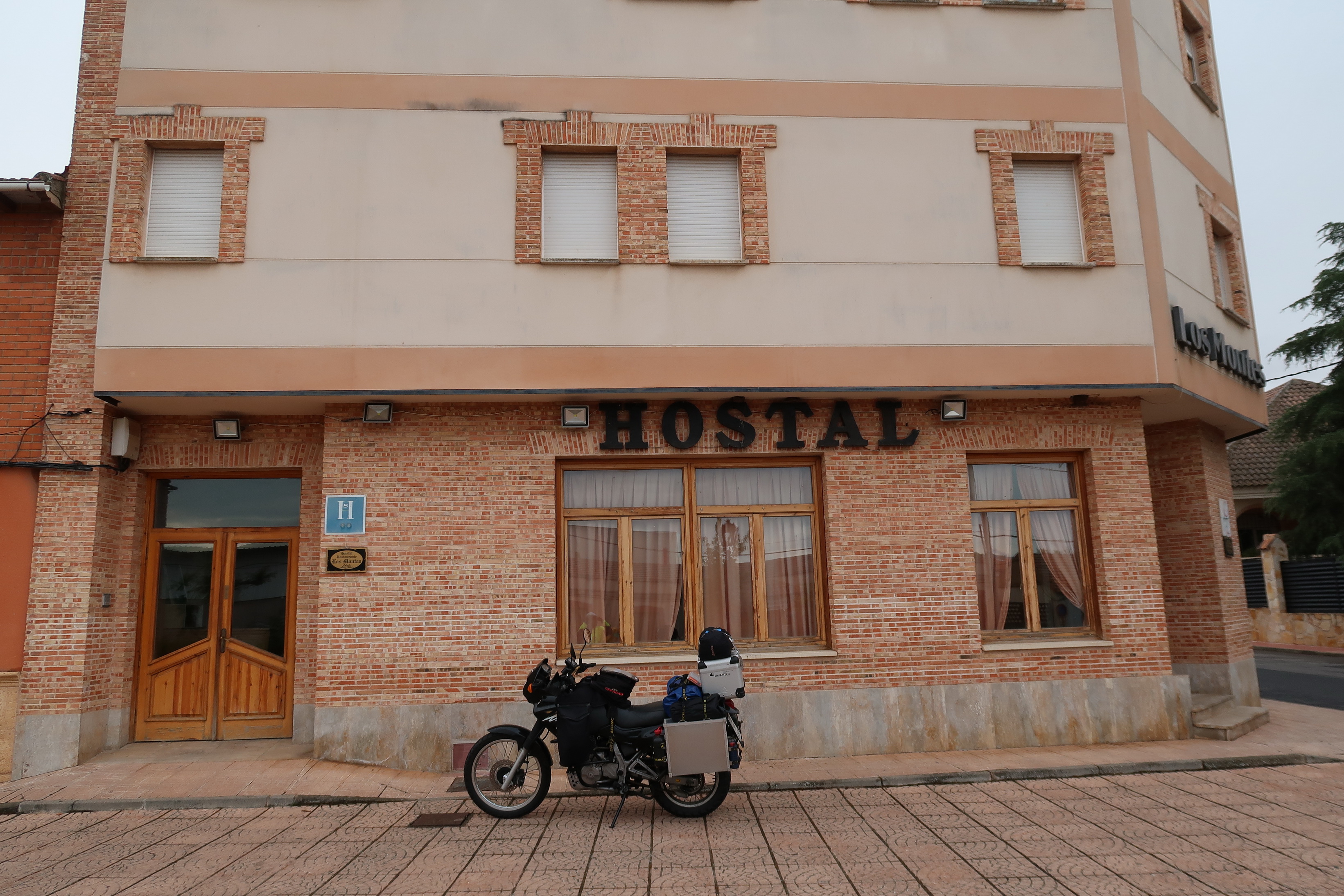 Vor Cuenca überlasse ich dem Navi die Regie. Stundenlang düse ich die Autobahn entlang. Öde! Nichts zu sehen, außer Weinbergen und Olivenhainen. Links und rechts zucken Blitze; ich aber fahre wie durch ein Wunder immer dorthin, wo es trocken bleibt. Langsam müsste mal ein Campingplatz auftauchen. Tut er aber nicht! Es ist schon spät abends, als mir klar wird, dass ich ein Hostal finden muss. In Malagon (https://de.wikipedia.org/wiki/Malag%C3%B3n) kann ich das örtliche Hostal trotz genauer Beschreibung eines Tankwarts lange nicht finden und fahre endlich frustriert nach Porzuna (https://es.wikipedia.org/wiki/Porzuna) weiter, wo ich das Hostal „Los Montes“ auf Anhieb finde. Es hat leider geschlossen. Langsam beginne ich mich mit dem Gedanken anzufreunden, nach Einbruch der Dunkelheit in einen Feldweg abzubiegen und an einer versteckten Stelle mein Zelt aufzuschlagen.