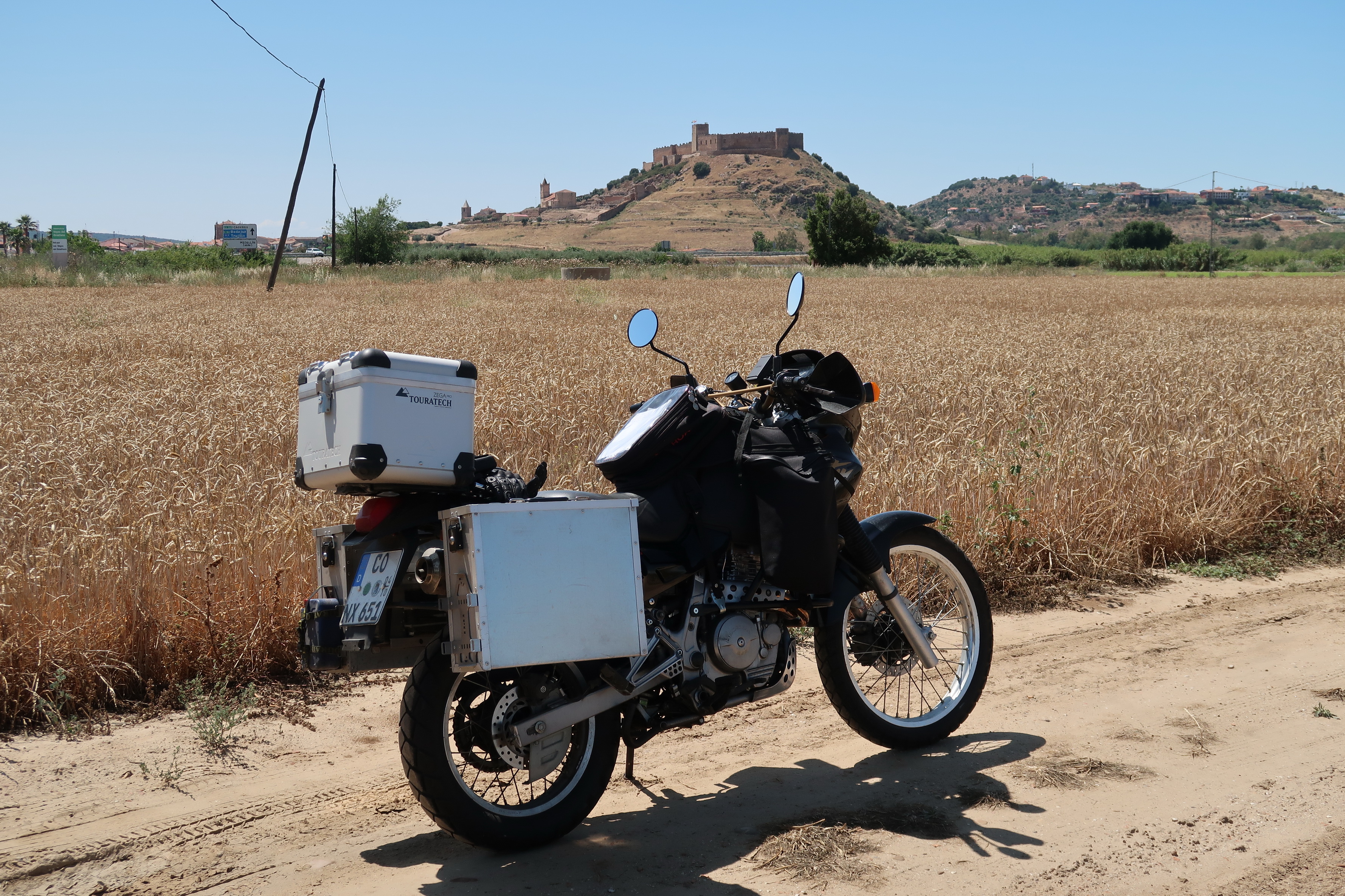 Donnerstag, 1. Juni: Zum Frühstück gibt es gebähtes Weißbrot vom Vortag mit einer großen Portion Käse. Nach einem Schwatz mit Nachbarin Marianne nehme ich gegen Mittag Kurs auf Montánchez ([https://de.wikipedia.org/wiki/Mont%C3%A1nchez]), das als Balkon der Extremadura gilt. Auf einem knapp 1.000 m hohen Berg gelegen, bietet es einen phänomenalen Rundblick auf die Ebene, die es umgibt. Zudem krönt den Ort ein schönes Castillo aus dem 12. Jahrhundert. Ich tuckere durch ein menschenleeres Land. Mitunter hat man den Eindruck, es gäbe mehr Störche als Menschen. Die Straßen sind gleichfalls leer und gut ausgebaut, weisen aber wenig Kurven aus, was den Fahrspaß reduziert. An das Tempolimit von 90 Knoten hält sich hier keiner. Gefahren wird mit mindestens 100 km/h, gern auch mit deutlich mehr. Seit 2019, als ich das letzte Mal in Spanien weilte, hat sich die Anzahl der Radarfallen erhöht, was die Spanier nicht wirklich vom Gasgeben abhält. Man muss halt wissen, wo die Fallen stehen.