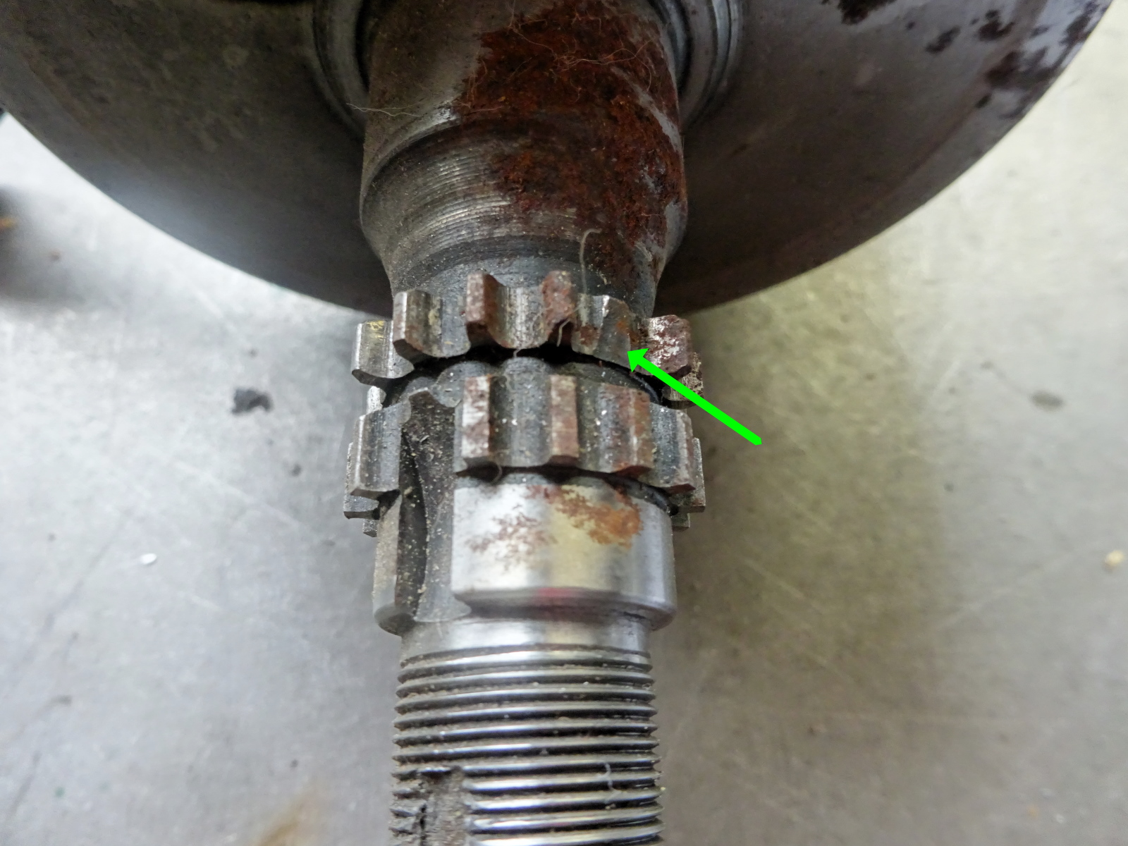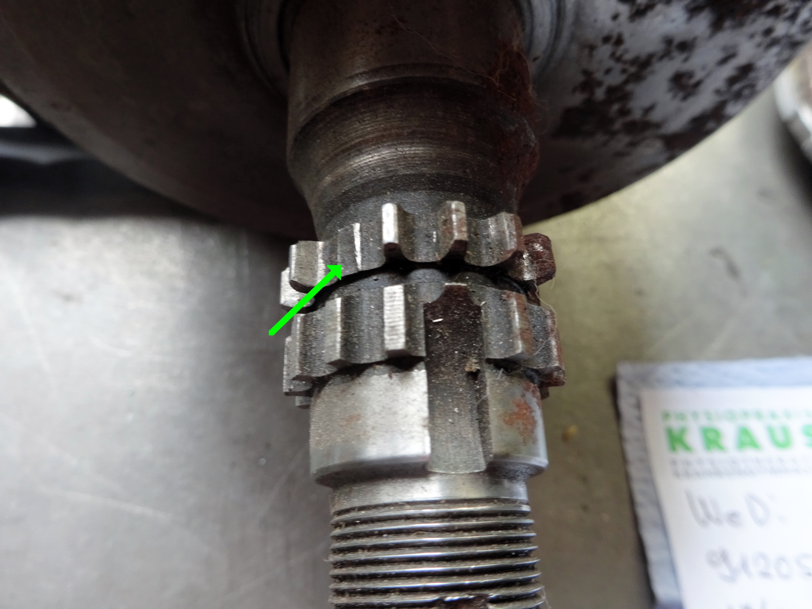 Wesentlich schlechter sieht es da schon bei der Verzahnung auf der rechten Kurbelwellen-Hälfte aus (welche die Steuerkette antreibt). wenn hier ein, oder mehrere Zähne ausgebrochen sind, dann ist die Welle ein Totalschaden und damit 'wegwerfreif'.