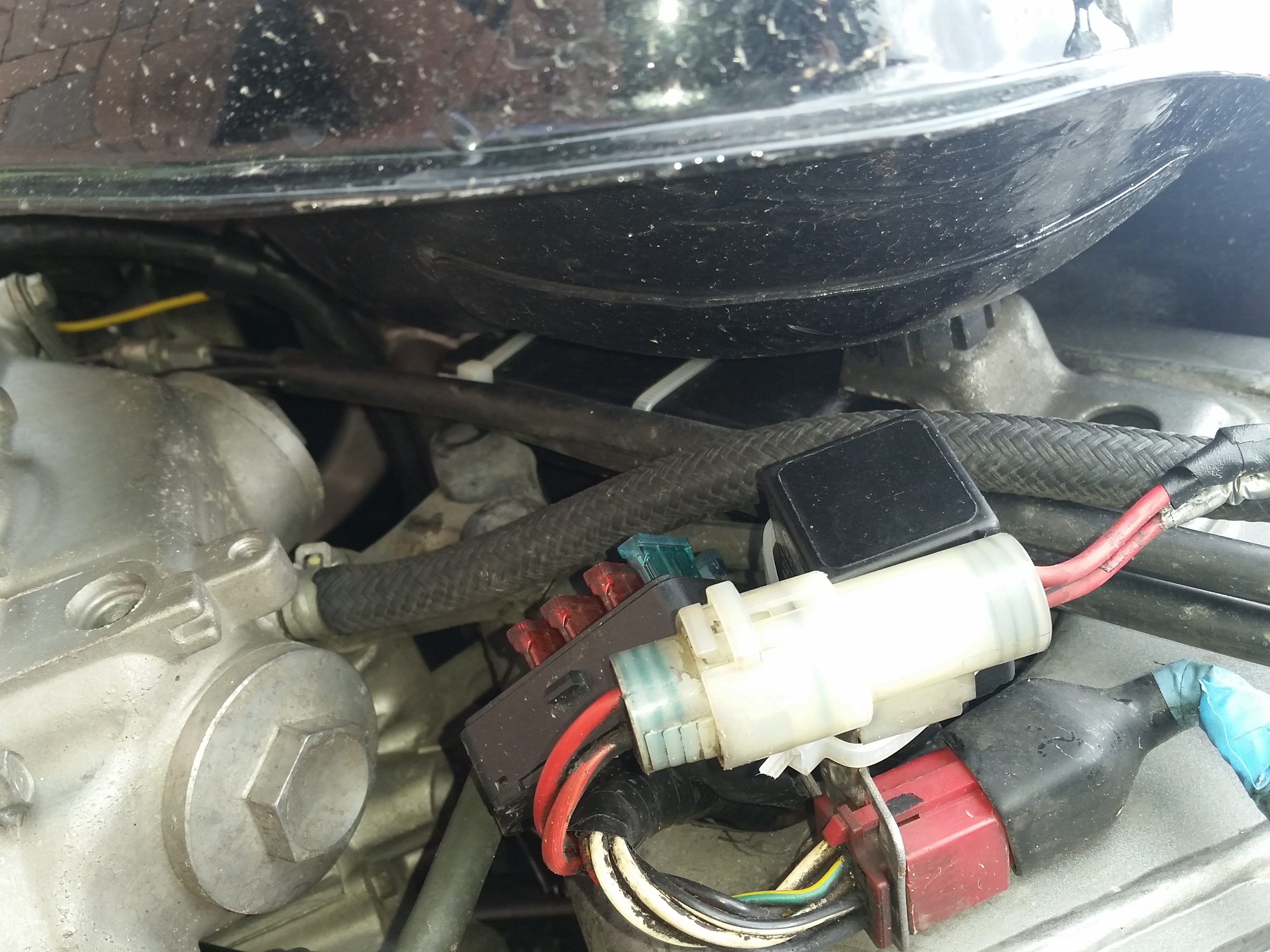 Blinkerrelais, Sicherungskasten und CDI sitzen ja vorne in der Verkleidungins da die Verkleidung weg ist, wurde die Teile unterm Tank befestigt, Kabelbaum ist aber der originale.