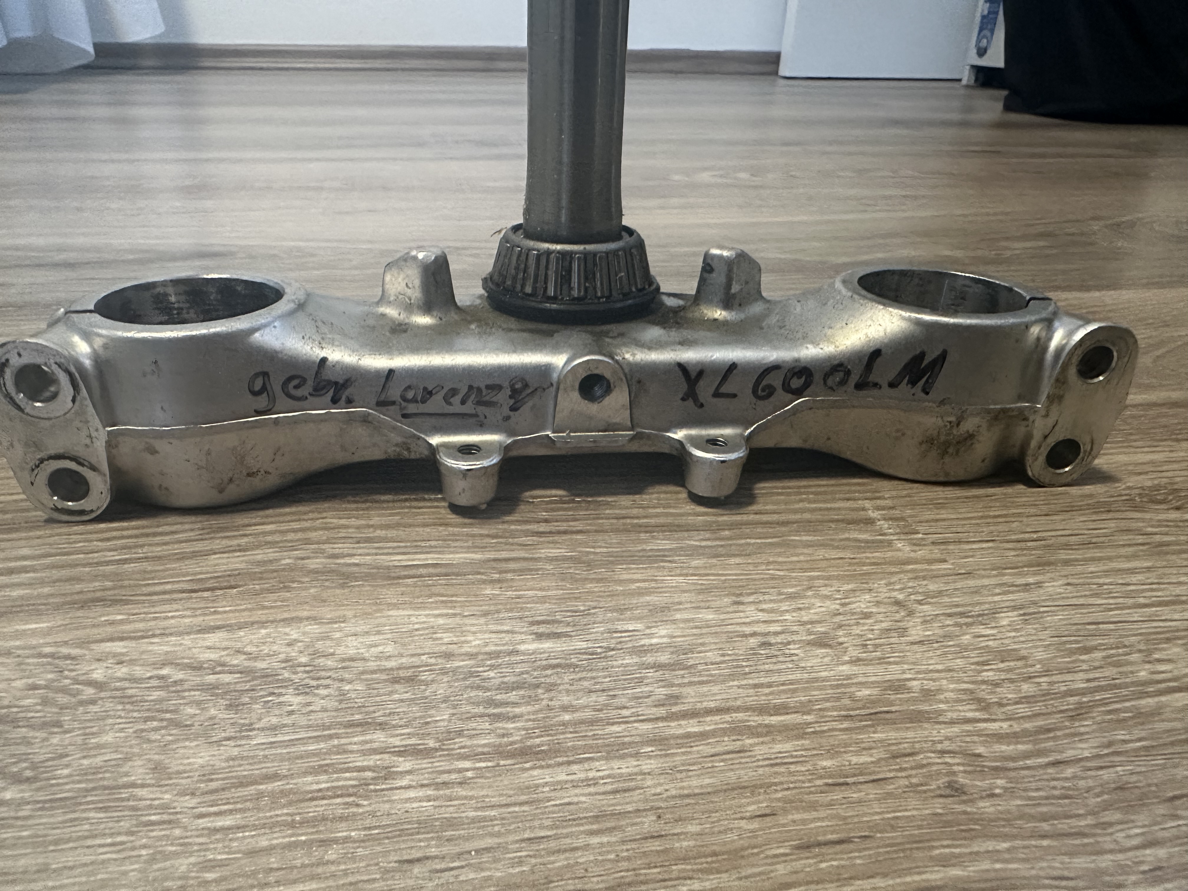 Zur XL600R oberen Gabelbrücke habe ich mir noch eine untere Brücke einer XL600L (gleiche untere Brücke) besorgt, da es wohl bei Mischung von NX und XL Brücken einen minimalen Unterschied zwischen Mitte Joch und Mitte Jochdurchgang obere Brücke gibt :