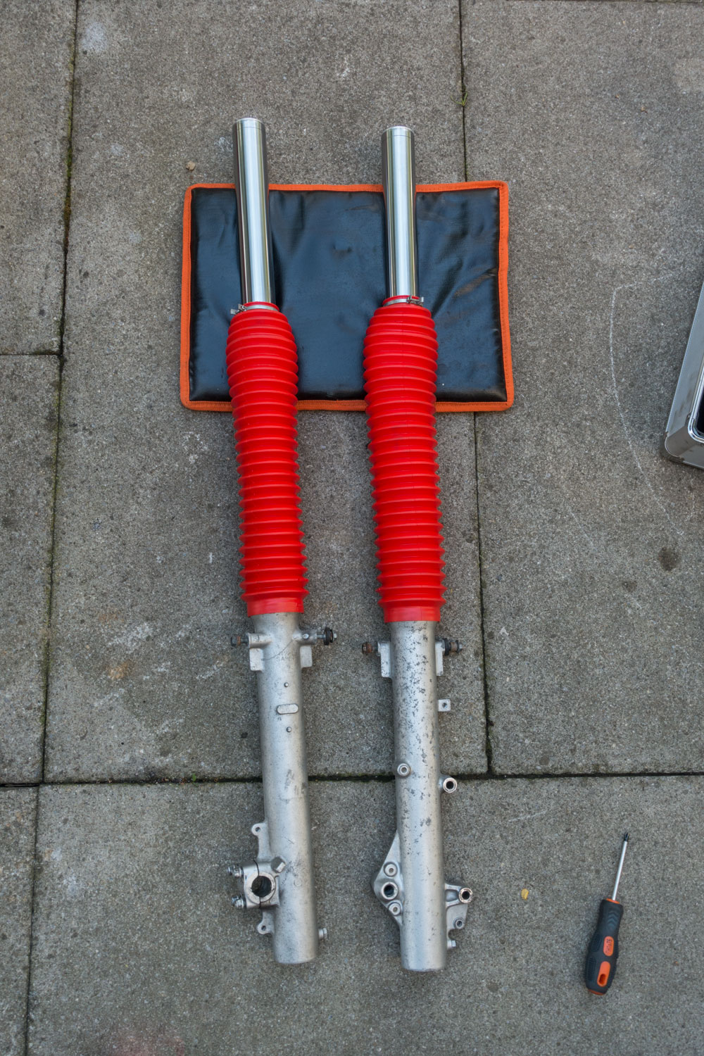 Gabelrohre ausgebaut, gründlich gereinigt und die Faltbälge gewechselt.