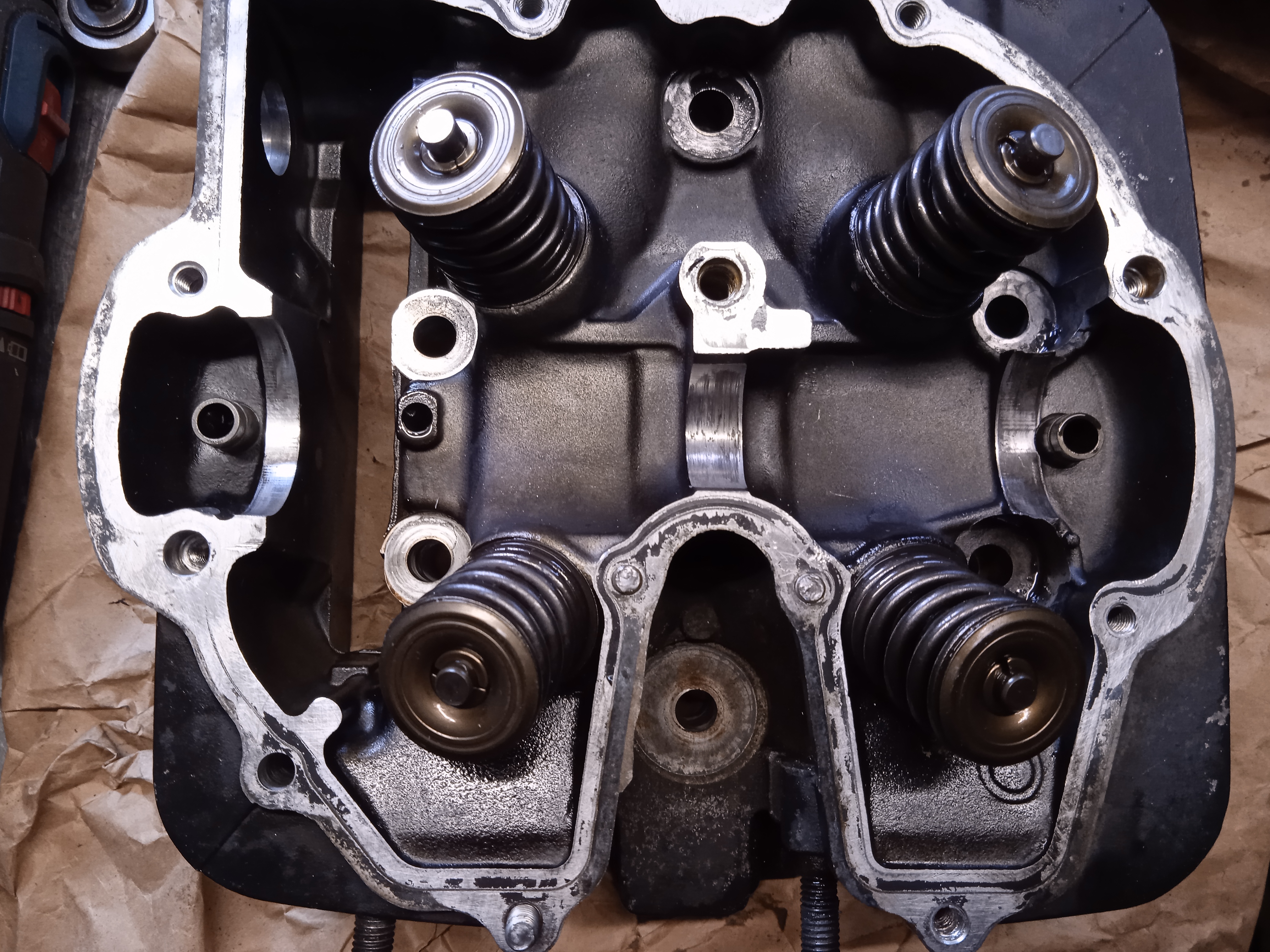 Als nächstes demontiere ich die Ventile und schaue nach den Sitzen und Führungen. Außerdem müssen noch die abgerissenen Schrauben entfernt werden...