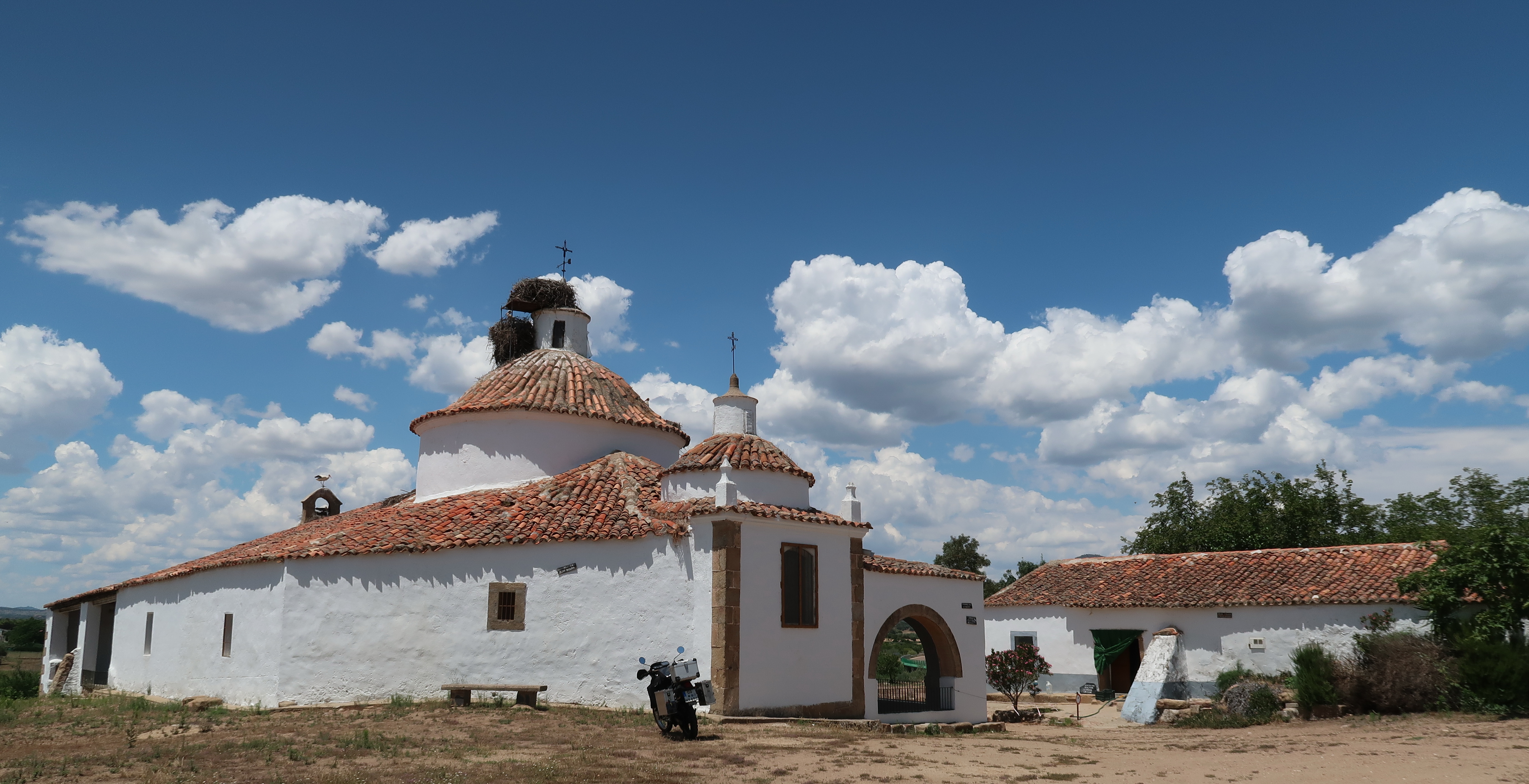 Donnerstag, 1. Juni: Zum Frühstück gibt es gebähtes Weißbrot vom Vortag mit einer großen Portion Käse. Nach einem Schwatz mit Nachbarin Marianne nehme ich gegen Mittag Kurs auf Montánchez ([https://de.wikipedia.org/wiki/Mont%C3%A1nchez]), das als Balkon der Extremadura gilt. Auf einem knapp 1.000 m hohen Berg gelegen, bietet es einen phänomenalen Rundblick auf die Ebene, die es umgibt. Zudem krönt den Ort ein schönes Castillo aus dem 12. Jahrhundert. Ich tuckere durch ein menschenleeres Land. Mitunter hat man den Eindruck, es gäbe mehr Störche als Menschen. Die Straßen sind gleichfalls leer und gut ausgebaut, weisen aber wenig Kurven aus, was den Fahrspaß reduziert. An das Tempolimit von 90 Knoten hält sich hier keiner. Gefahren wird mit mindestens 100 km/h, gern auch mit deutlich mehr. Seit 2019, als ich das letzte Mal in Spanien weilte, hat sich die Anzahl der Radarfallen erhöht, was die Spanier nicht wirklich vom Gasgeben abhält. Man muss halt wissen, wo die Fallen stehen.