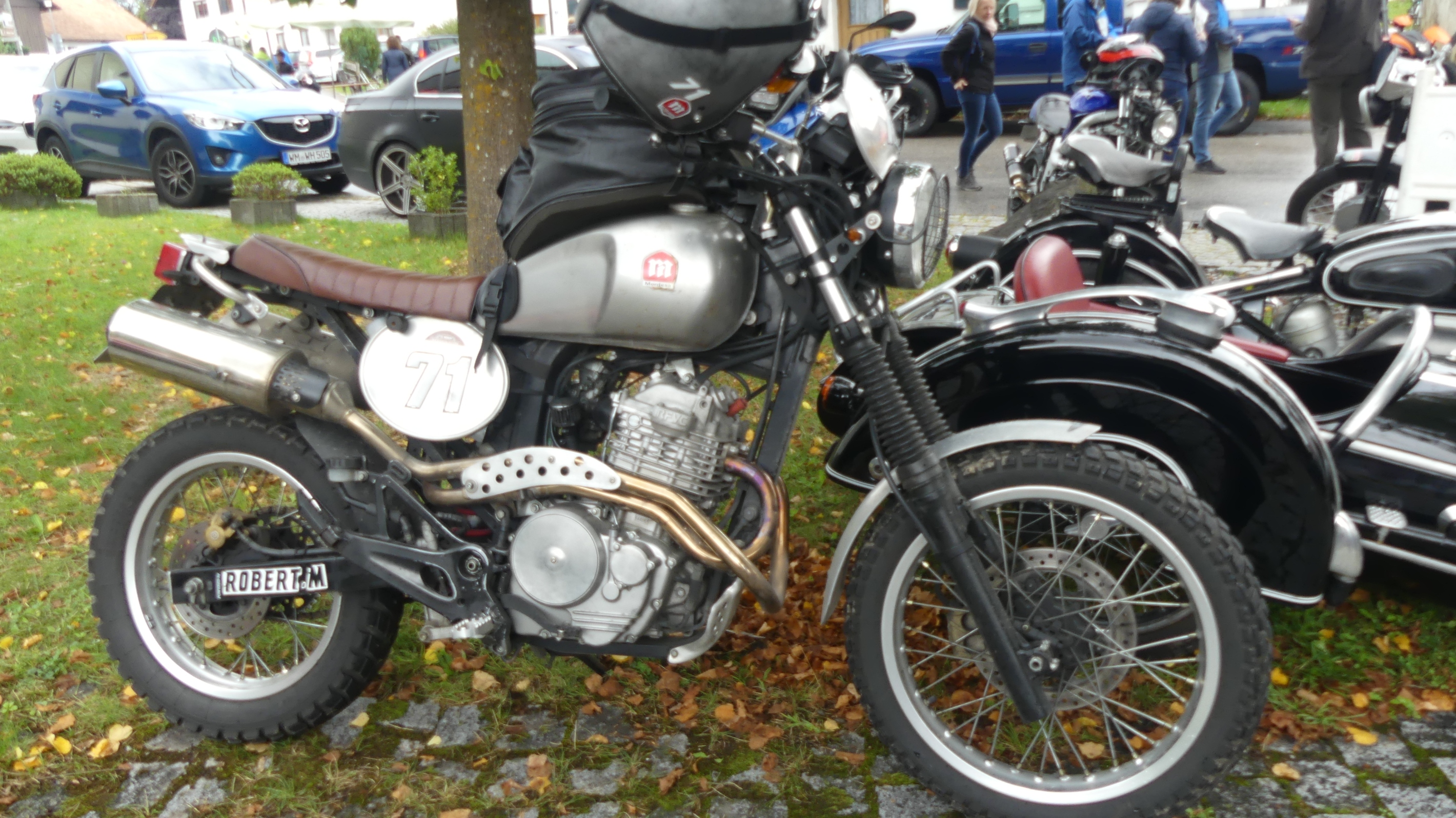 Am Wochenende war in Bernbeuren die Auerberg-Klassik, ein Bergrennen für Oldtimer-Motorräder. Gleichzeitig fand im Ortskern eine Ausstellung moderner Motorräder und die Bewirtung statt. Wer ein älteres Motorrad fuhr, durfte da rein. Und da stand diese SLR-Scrambler. Konnte kurz mit dem Besitzer zu zwei Details sprechen: Tank aus China und vom TÜV abgenommen sowie Egu-Krümmer.