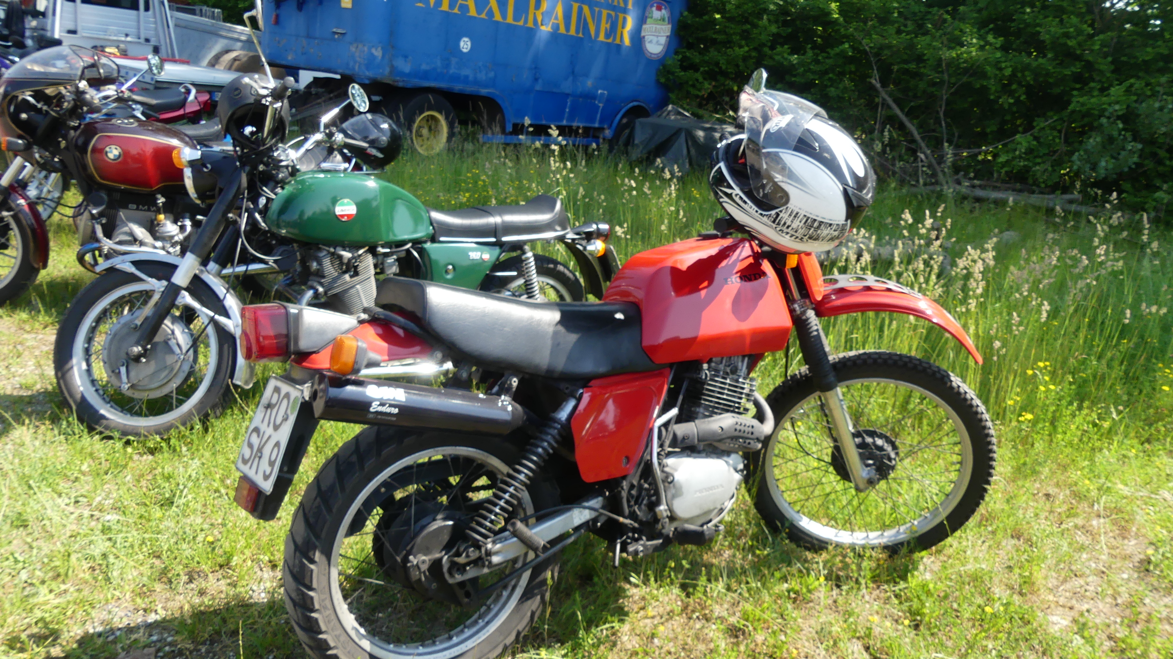 Keine Domis, aber Vorgängermodelle von Honda: Beim Maxlrainer Oldie Feeling an Fronleichnam mit knapp 5000 Oldtimern stand diese XL 600 L; habe ich lange keine mehr gesehen. Mit diesem Modell haben damals aus meinem Motorradclub Engstingen jeweils ein Pärchen mehrwöchige Touren durch Amerika und die Türkei unternommen, mit voller Campingausrüstung. Die meisten XT 500 Fahrer träumten von einem Tank wie die XL 500 S auf dem anderen Bild hat. Heute geht der Trend ja auch bei den Enduros wieder zur Orginalität, da war mir diese Maschine ein Bild fürs Archiv wert. Und dann lief mir gestern diese XR 600 R am Gaisberg bei Salzburg in der Fankurve beim Bergrennen über den Weg. Eine Winterbastlerei aus Garagen- und Kellerbeständen unter Verwendung einer XR 600 mit Yamaha XT 500-Tank, Louis-Zubehörauspuff, Vorderradfelge von der SLR und was halt da sonst noch rumlag.