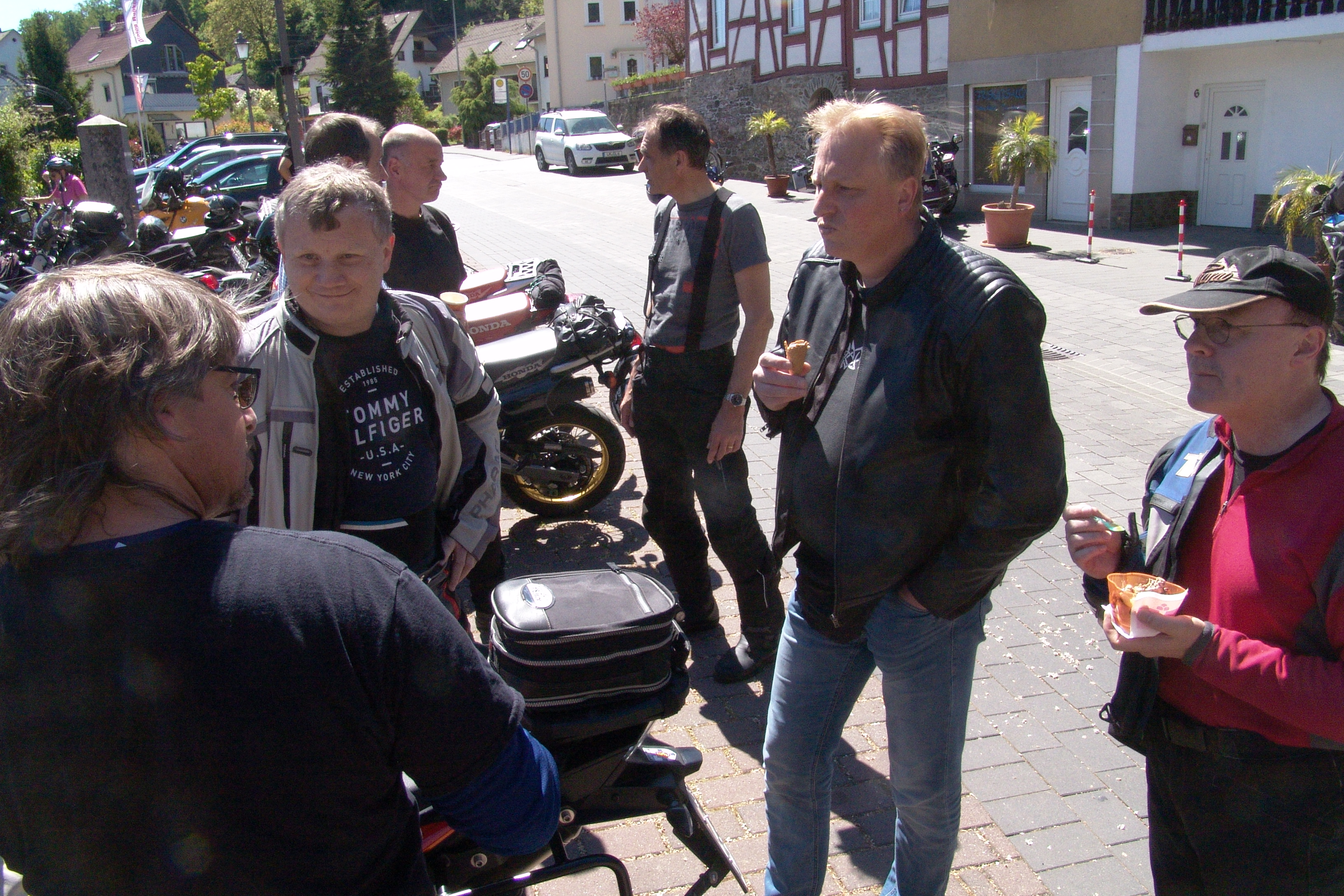 Mit dann 12 Motorrädern ging es durchs Weiltal nach Runkel an der Lahn, wo Rölf seine erste Mahlzeit des Tages zu sich nahm - lecker Eis. Wie vereinbart trafen dann unsere Forumsmitglieder aus Staugustin ein, Sylvia und Andreas ( der dritte am heutigen Tag