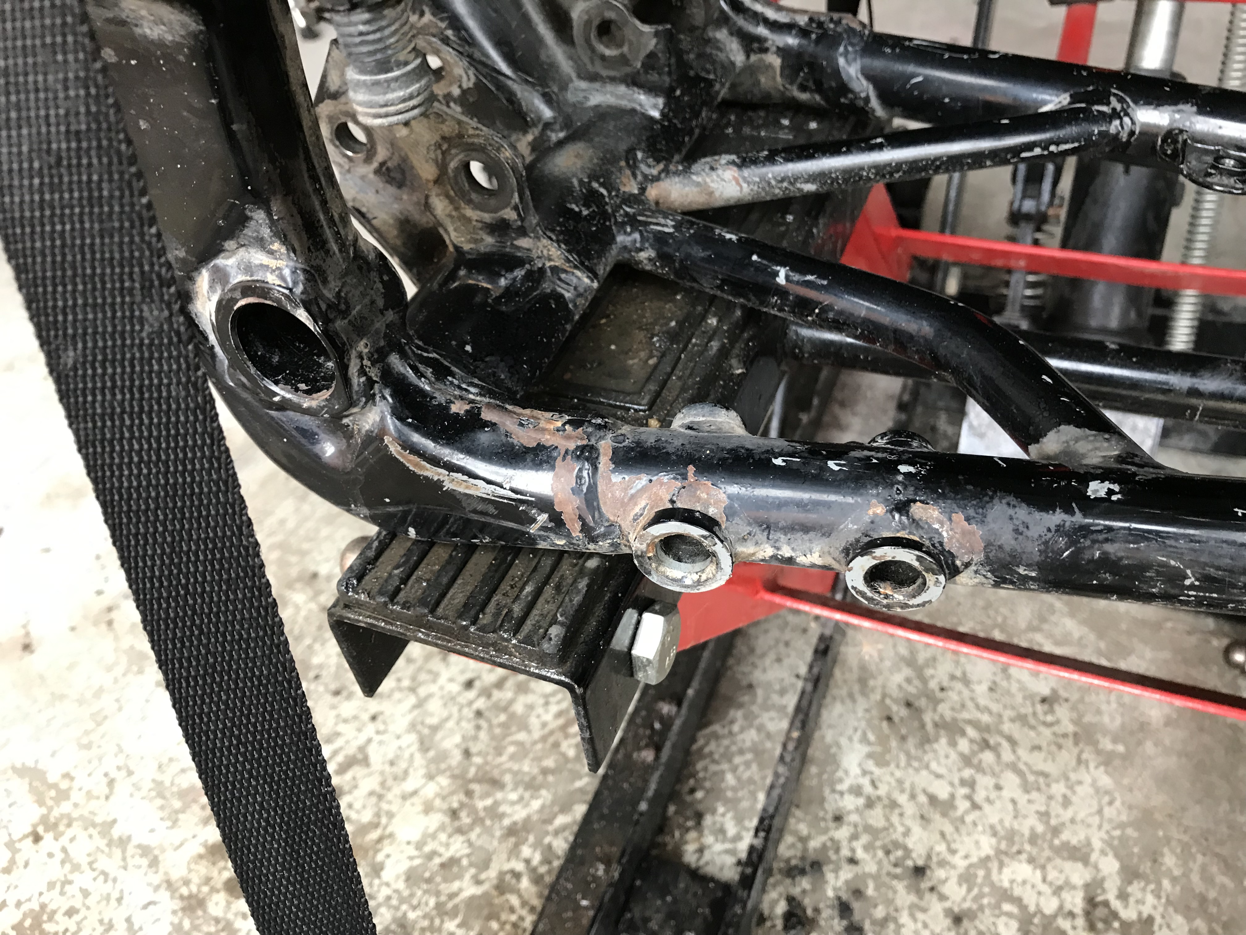 Wenn se wirklich rein ist (Rahmen), das heißt Fett und Öl frei, den Rost mit der Stahlbürste bearbeiten und dann ein bisschen Spray aus der Lackdose drüber. Nur nicht Rally Mattlack. Ich habe da ein guten, Für z.B. Gabelbrücken, Fussrasten usw. mal schnell nachlacken ist der sehr gut, in fünf Min trocken. Ich mach mal nachher Foto.