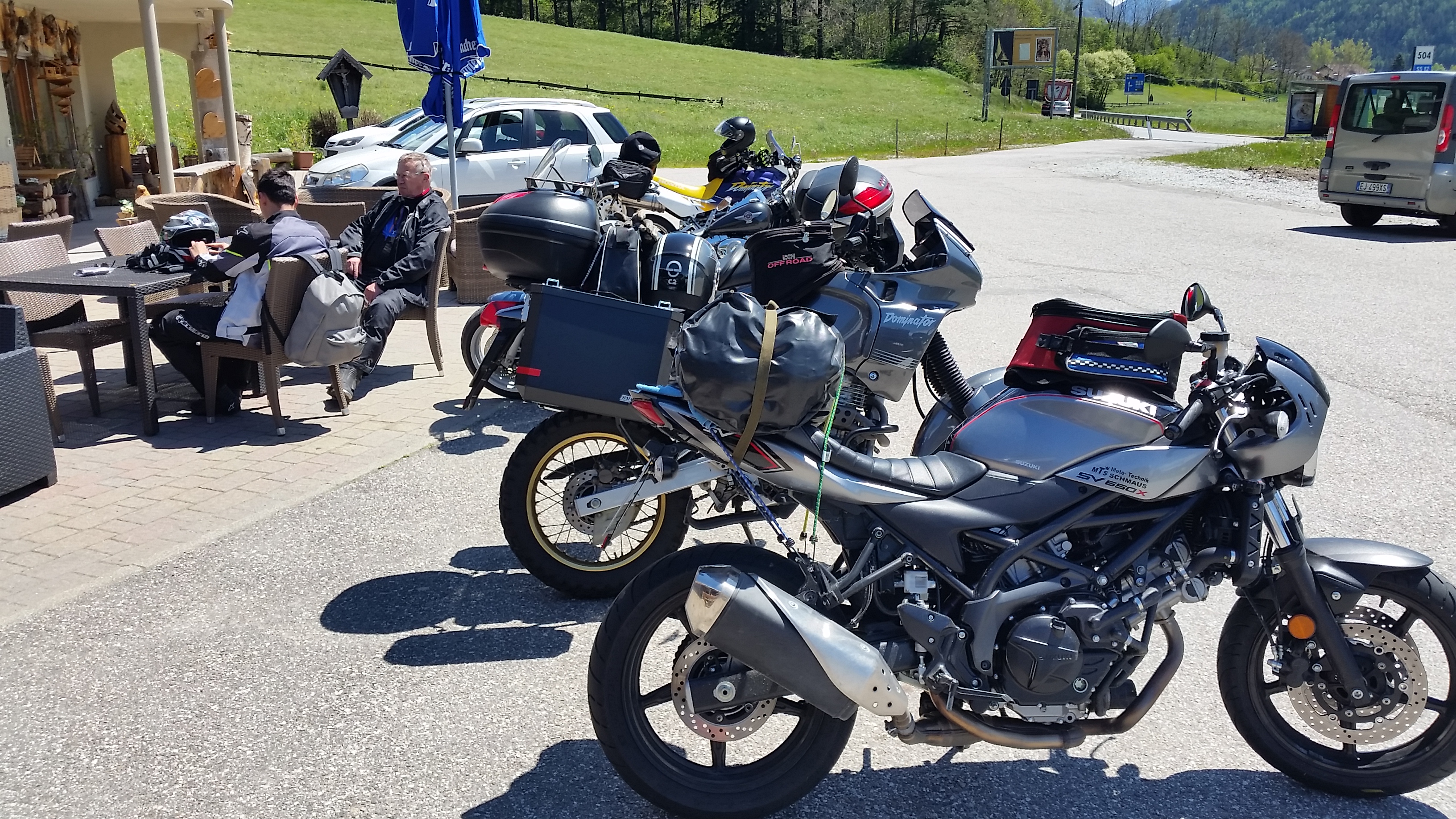 Der Plan sah so aus, daß wir unser Gespann dort stehenlassen und mit den beiden Mopeds Stoppelhopps und PöttPöttPött (CRF 250L) weiterfahren. Aufgrund der schlechten Wettervorhersage (großes Tiefdruckgebiet mit Starkregen) sind wir dann mit dem Gespann weiter gefahren zum Gardasee. Bei bestem Wetter, erst ab Bozen hat es geregnet.