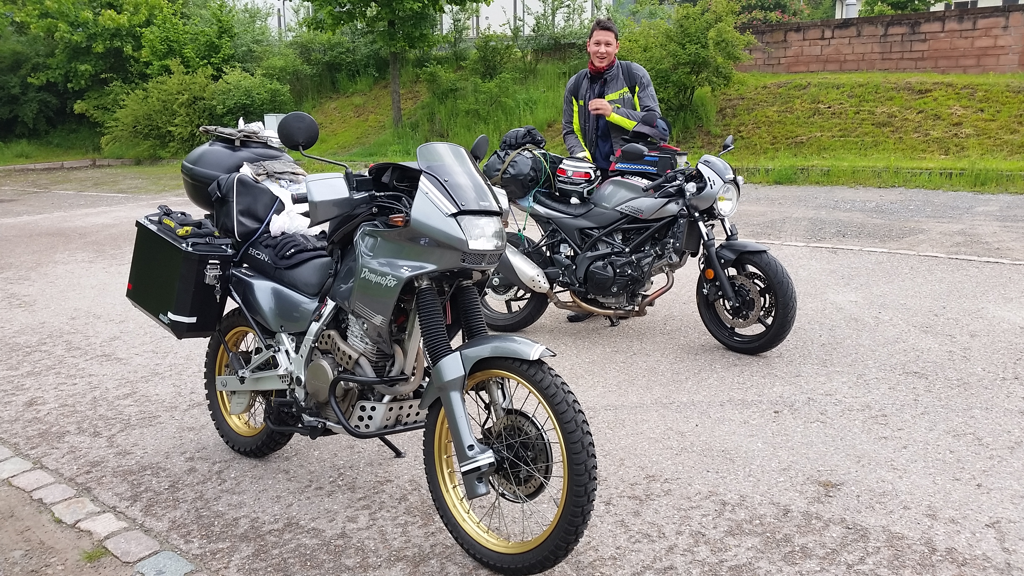 Für Ralf und mich ging die Reise schon am Samstag davor los. Wir sind mit Volvo und Anhänger und 2 1/2 Mopeds nach Knittlingen zu Thorsten (Borsti) und Andrea (PummelHummel) gefahren. Thorsten hat meinen Stadtmusikanten NX250 Teileträger übernommen. Wir haben abends gegrillt und da übernachtet (Danke nochmal