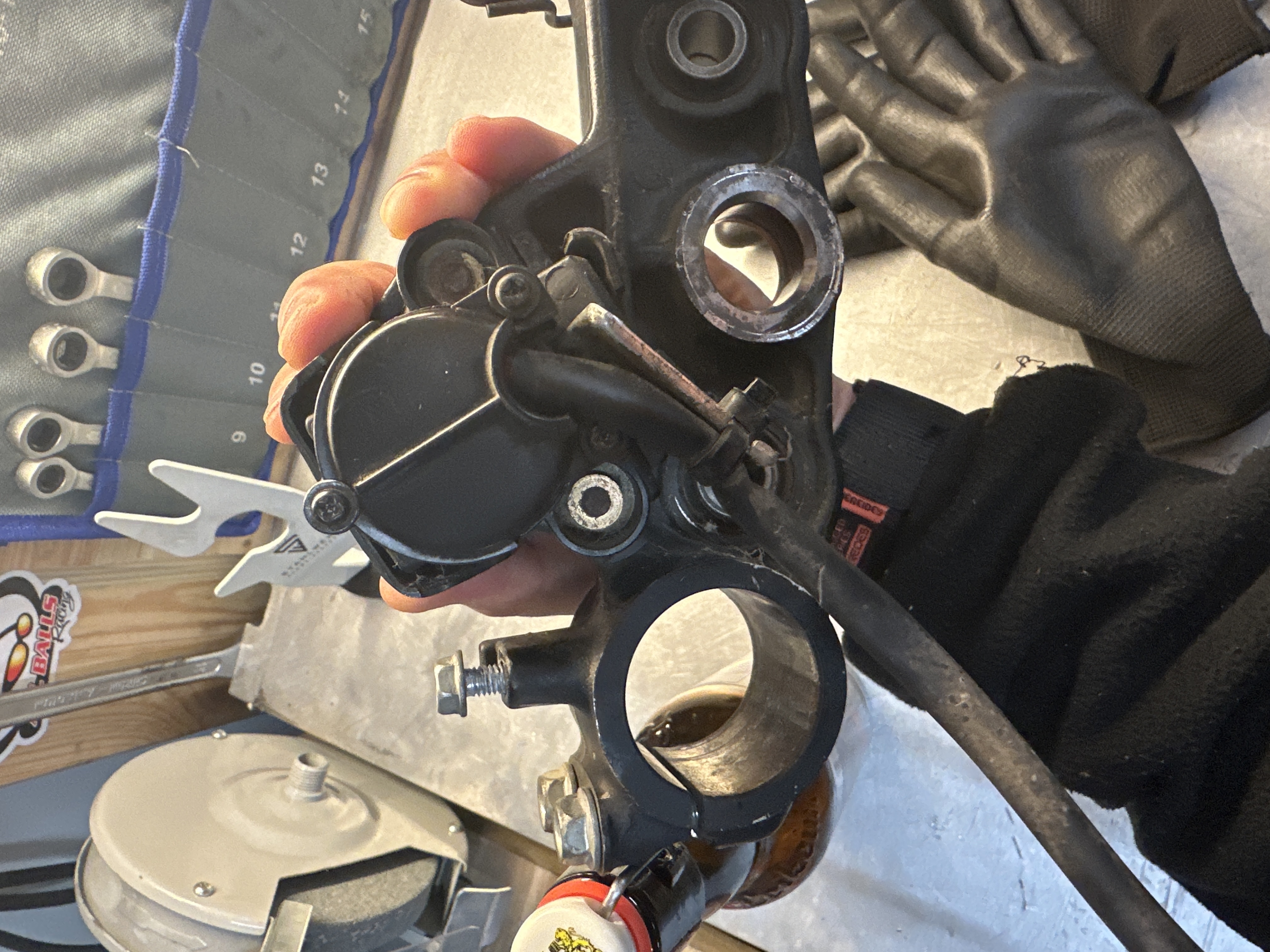Theoretisch wäre es auch mit dem originalen gegangen, aber ich kann ja nicht das Mopped komplett durchpflegen und mit gutem Gewissen unter dem Lenkkopf ein angefressenes Joch verstecken...