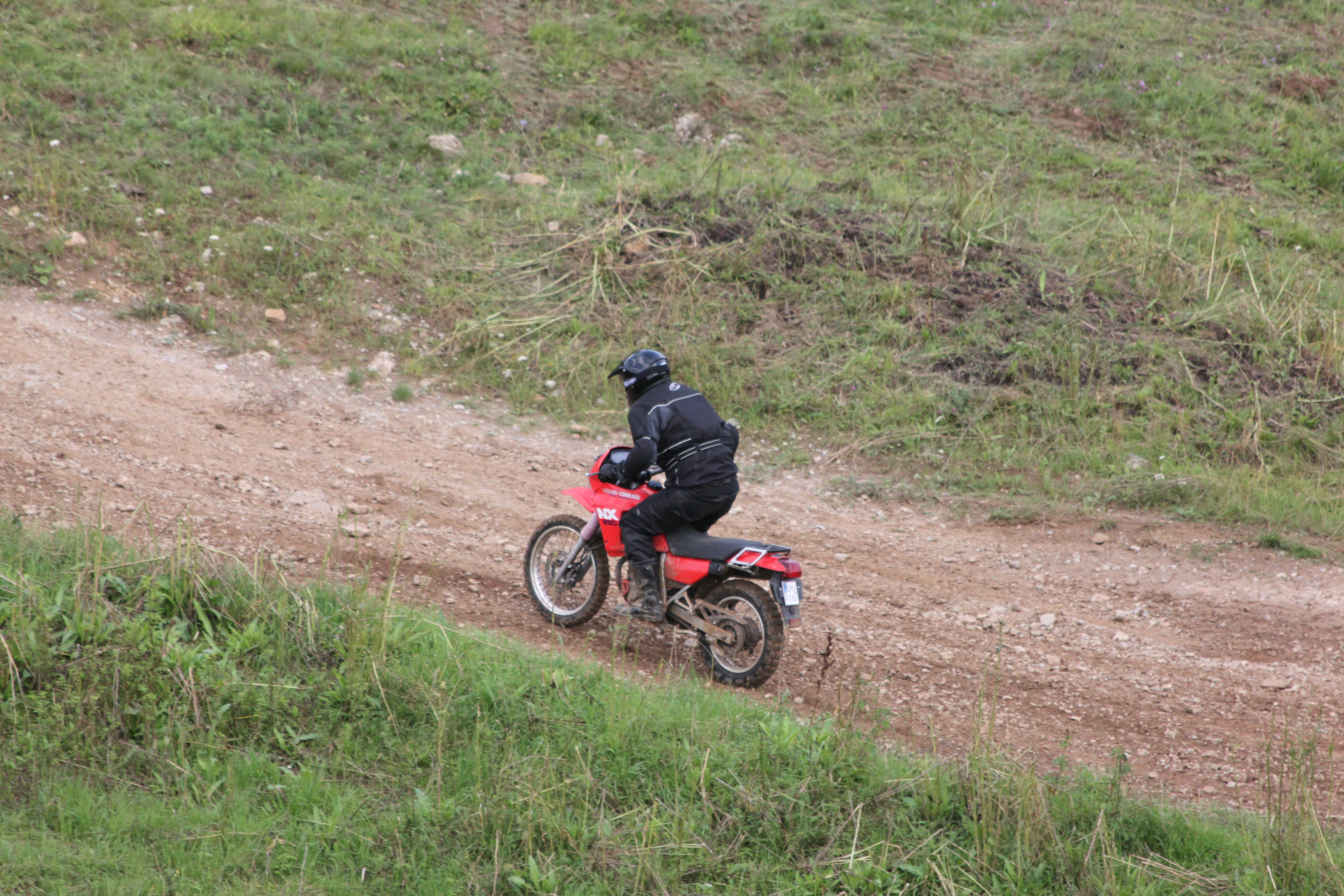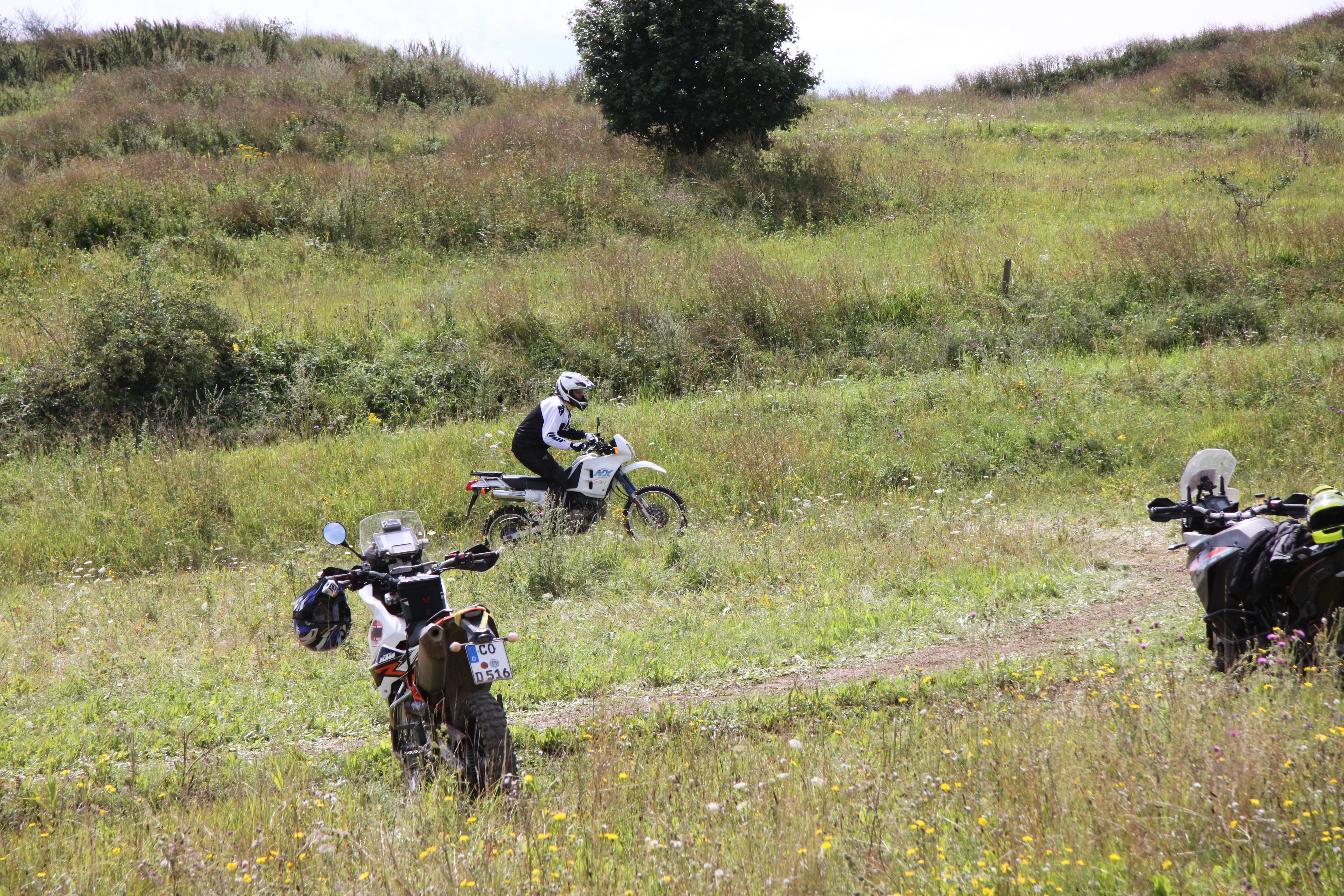 Hierbei wechselte ich allerdings das Moped und fuhr mit Annas Nixe eine Runde. Ilona und Jan fuhren mit. Aber auch dieses Mal verpassten wir an einer Stelle den richtigen Abzweig, so dass wir auf der Crossstrecke landeten. Wir entschieden uns, diese komplett fertig zu fahren. Mit der kleinen Domi klappte dies wunderbar. Wahrscheinlich auch deshalb, weil ich wusste, dass sie mit nagelneuen TKCs ausgerüstet ist. Traktion war stets vorhanden. Und 23 PS reichen auch im Gelände.