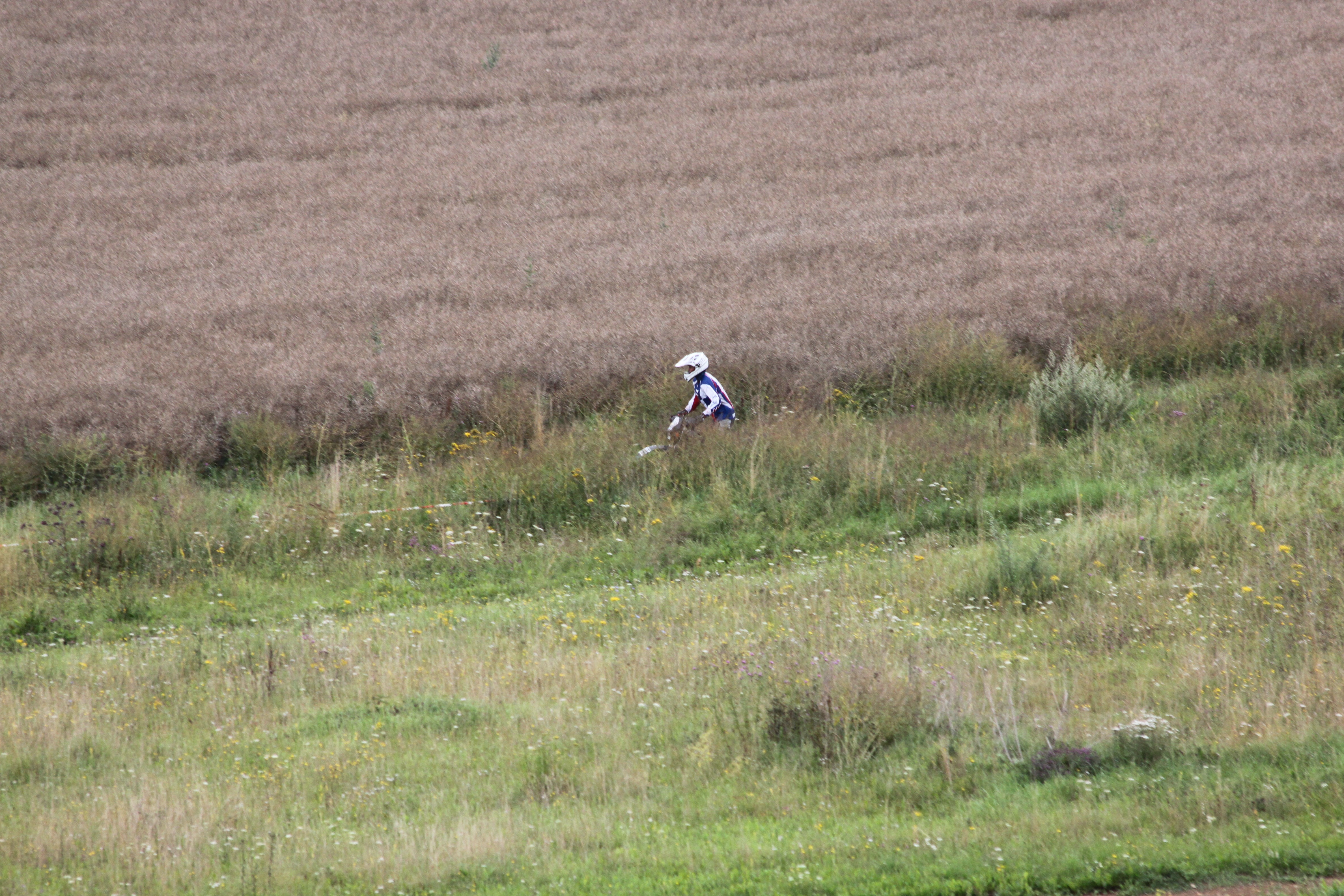 Also, zweiter Versuch. Es lief einigermaßen. Nach ein paar Runden auf der leichten Strecke wollte ich mal den Enduro-Trail ausprobieren. In der ersten Schlammpassage musste ich leidvoll feststellen, dass meine abgefahrenen Heidenaus doch nicht mehr richtig taugten. Erneut lag die Domi (dieses mal aber kontrolliert) auf der Seite. Wieder ein paar Kurven weiter hatte ich jedoch den Faden verloren bzw. keine Streckenmarkierung gefunden, die mir den Weg wies. Ich bog falsch ab und landete prompt am Ausgang der Strecke. Na gut, machst mal Pause und fährst in ein paar Minuten nochmal raus!