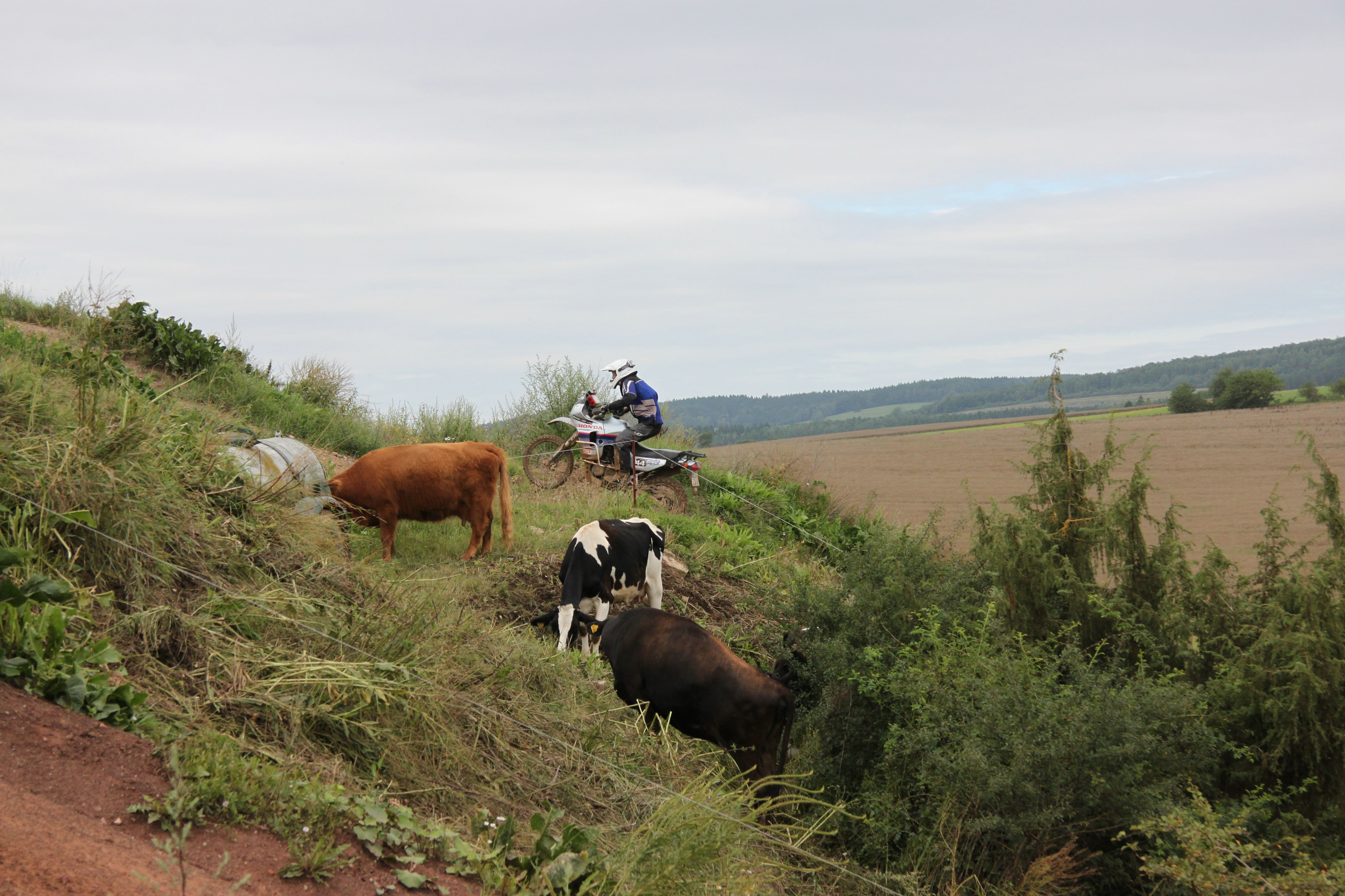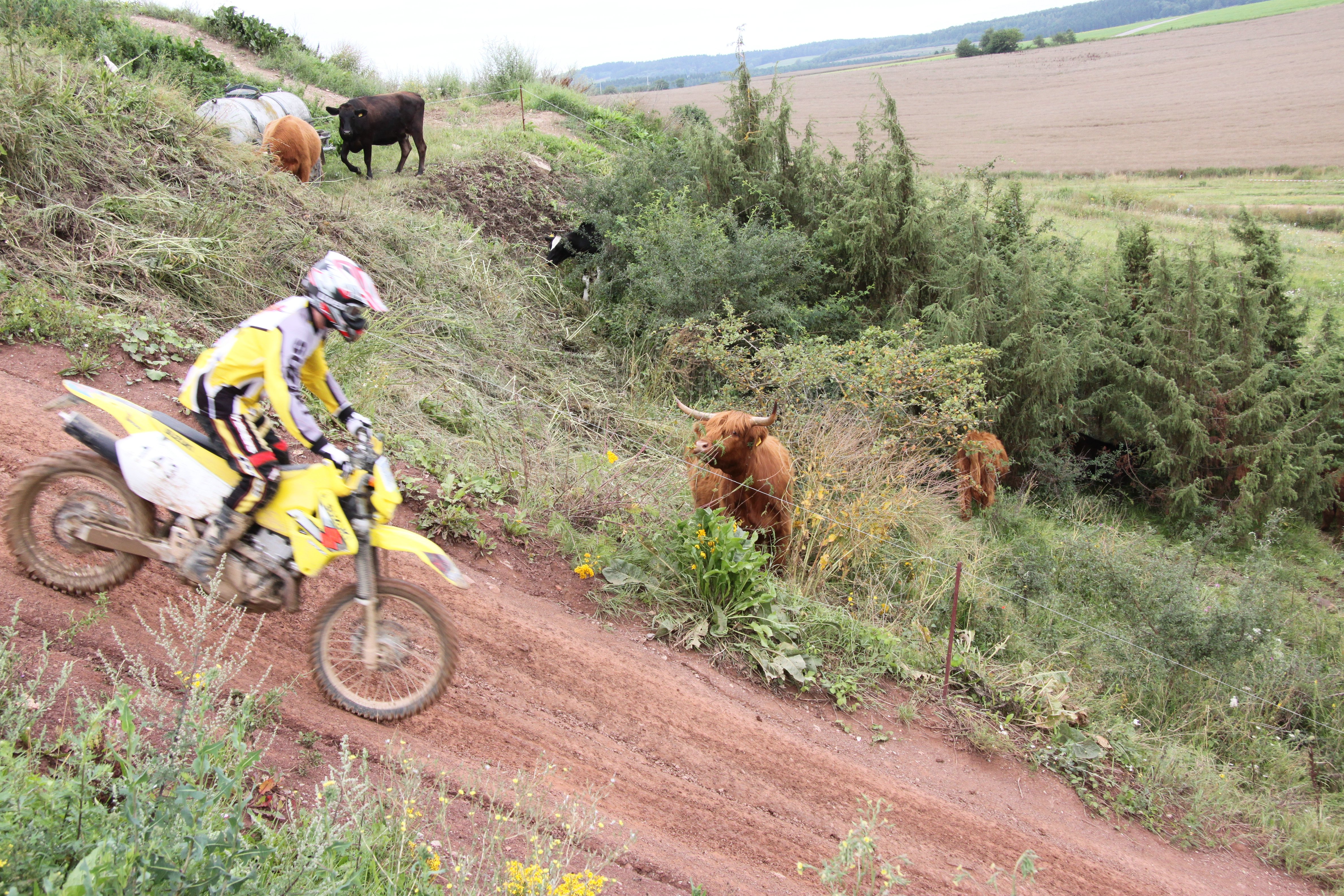 Nein. Das sind Endurokühe. Ihre Weide liegt mitten im Gelände der Crossstrecke. Das sind die gewohnt. Stefan Hessler hatte es in seiner "Ansprache" auch extra erwähnt, dass die Kühe das "Business" um sie herum als normal empfinden.