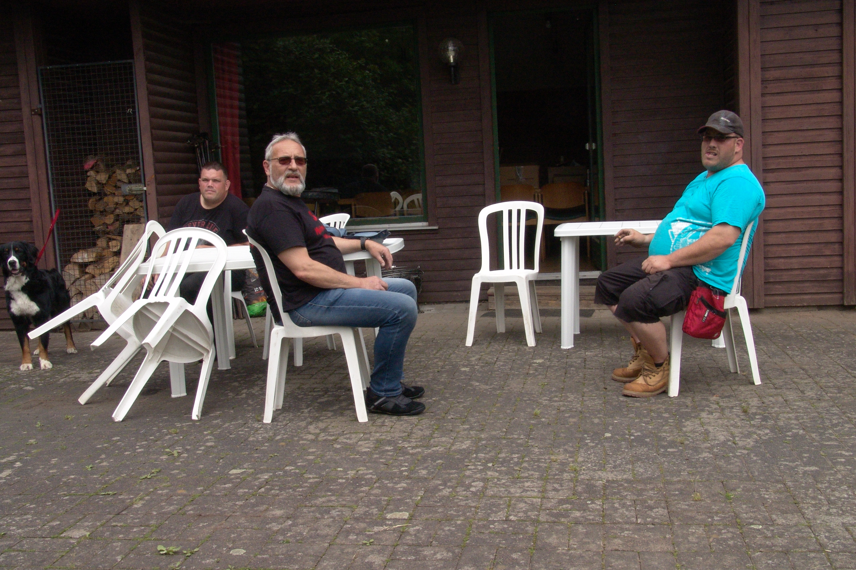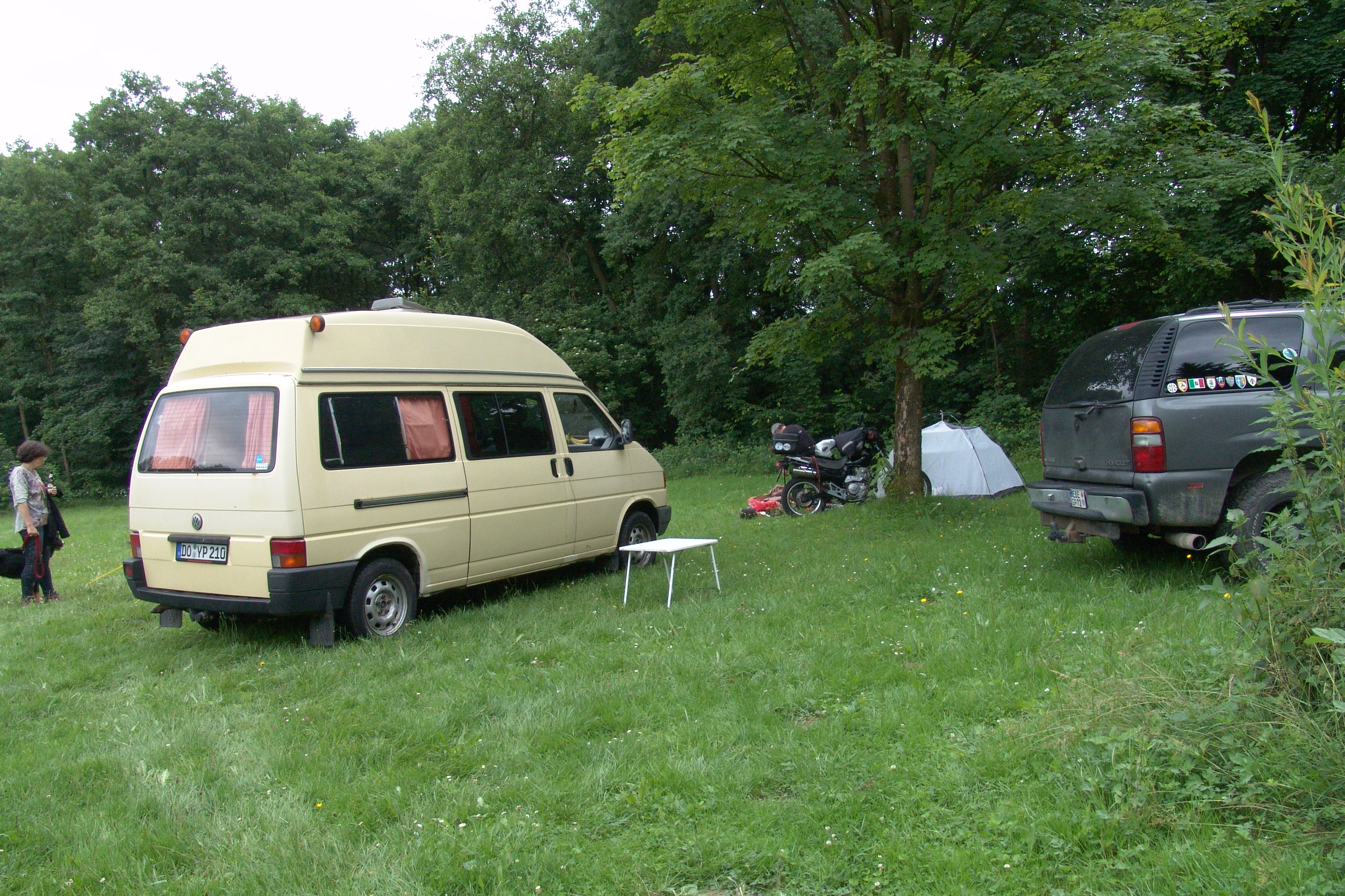 Am Freitag früh starteten wir, das waren Uwe ( ujr56 ), Lotte, Sabine und ich gen Treffengelände. Auf dem Weg dorthin wurden die Schäfchen noch versorgt und die 40 KIlo Hund scharfgeschaltet. Im Feriendorf angekommen trafen wir schon auf zwei Mitstreiter, die schon am Donnerstagabend dort eintrafen, Der Sascha und Der Bruder. Ebenfalls trafen kurz nach uns Skully und Michael1972 sowie Enduro-Hexe und Michael mit neuem Vierbeiner ein, ebenso MS. MAtilda auf eigener Achse ( Archimedes ). Mit vereinten Kräften und dem Treffenorgawissen von Uwe wurde dann das Zelt aufgebaut, die Getränke abgeladen und in den Kühlschränken verstaut und die Banner aufgehängt.