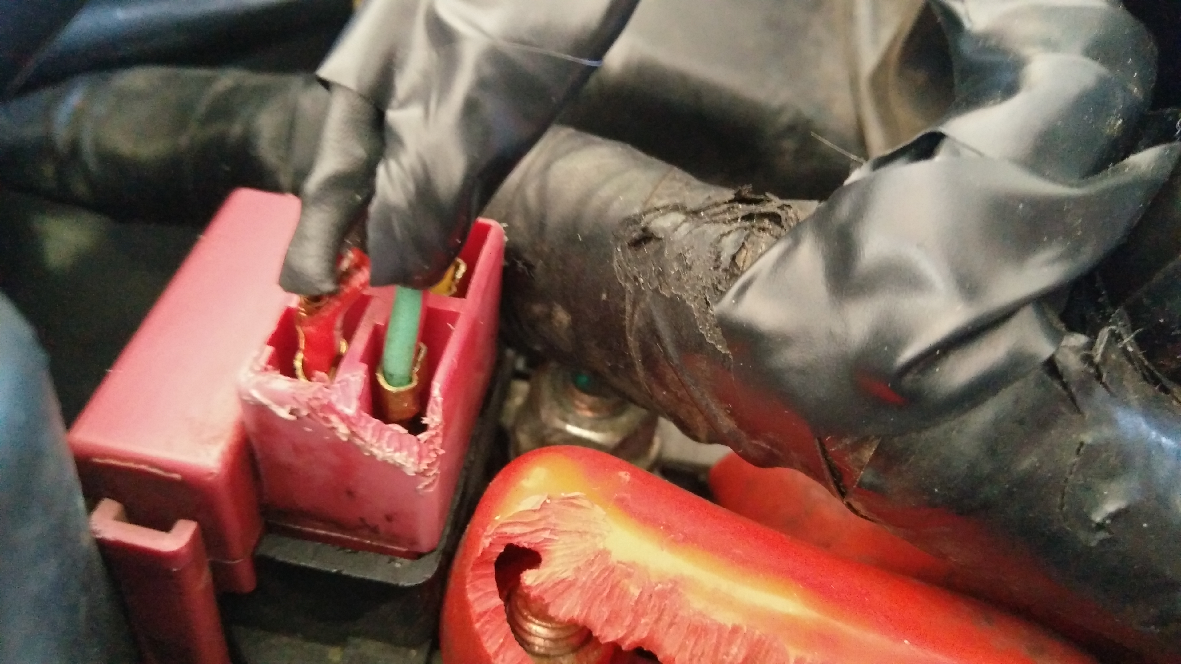 Das rote Kabel sieht doch aus als währe es durchgetrennt.