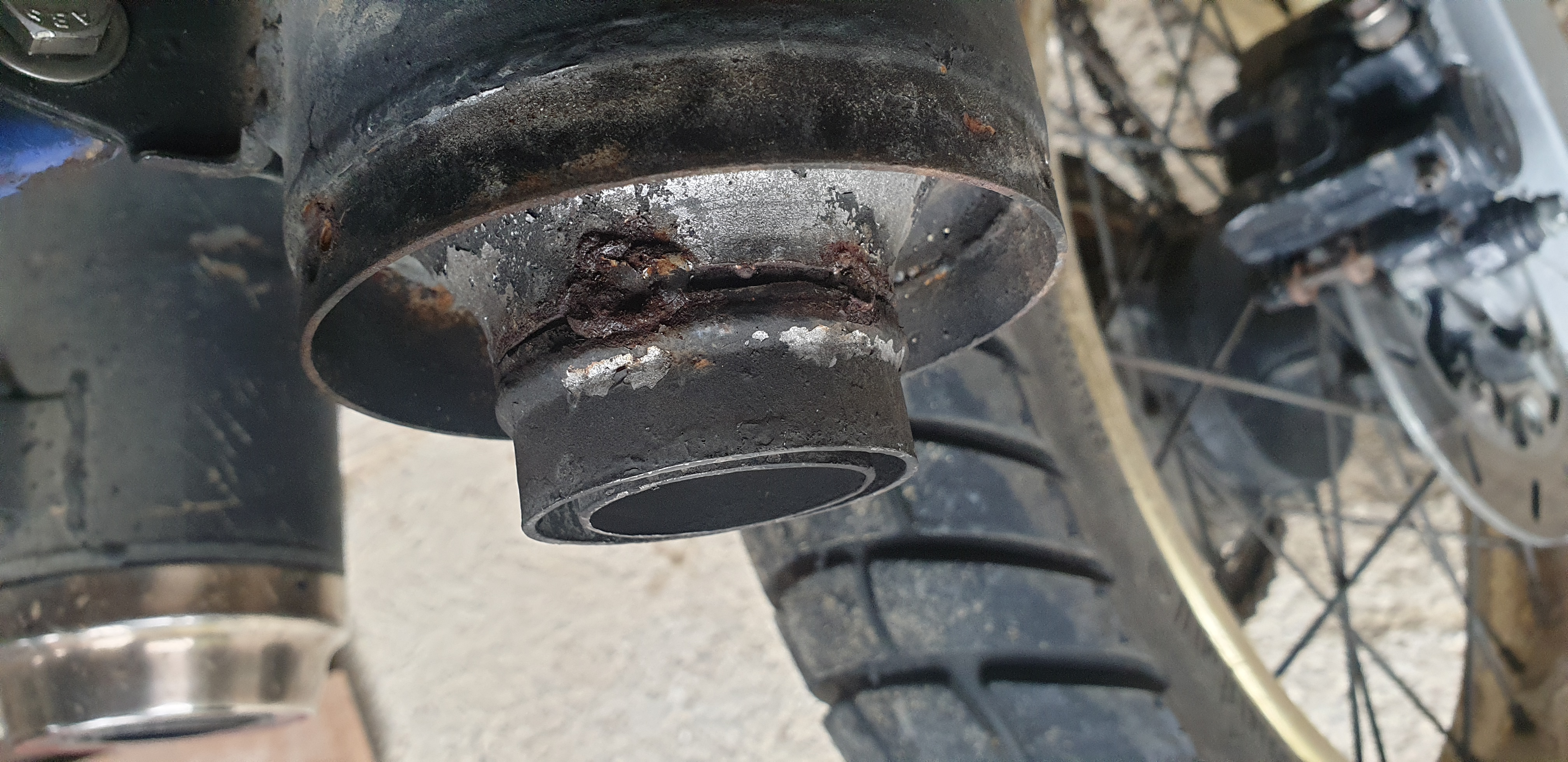Die Maschine hat vor Feb 2018 sicher sehr lange gestanden. Aber ich bin ja seitdem über 13,000 km gefahren ohne Vergaserprobleme. Ich hab heute morgen den Auspuff abgebaut und drinnen scheppert es ordentlich. Leider kann mein Bekannter hier das Ding nicht wieder zu schweissen. Ich check heute Nachmittag in einer Traktowerkstatt im Dorf ob die das wieder zu bekämen wenn ichs mit der Flex aufschneide. Wenn das geht versuch ich mit "entleertem" Endschalldämpfer mein Glück. Auf den Fotos sieht man die beiden alten Schweisspunkte. Einmal ganz am Ende, eine weitere senkrecht verlaufende Schweissnaht.