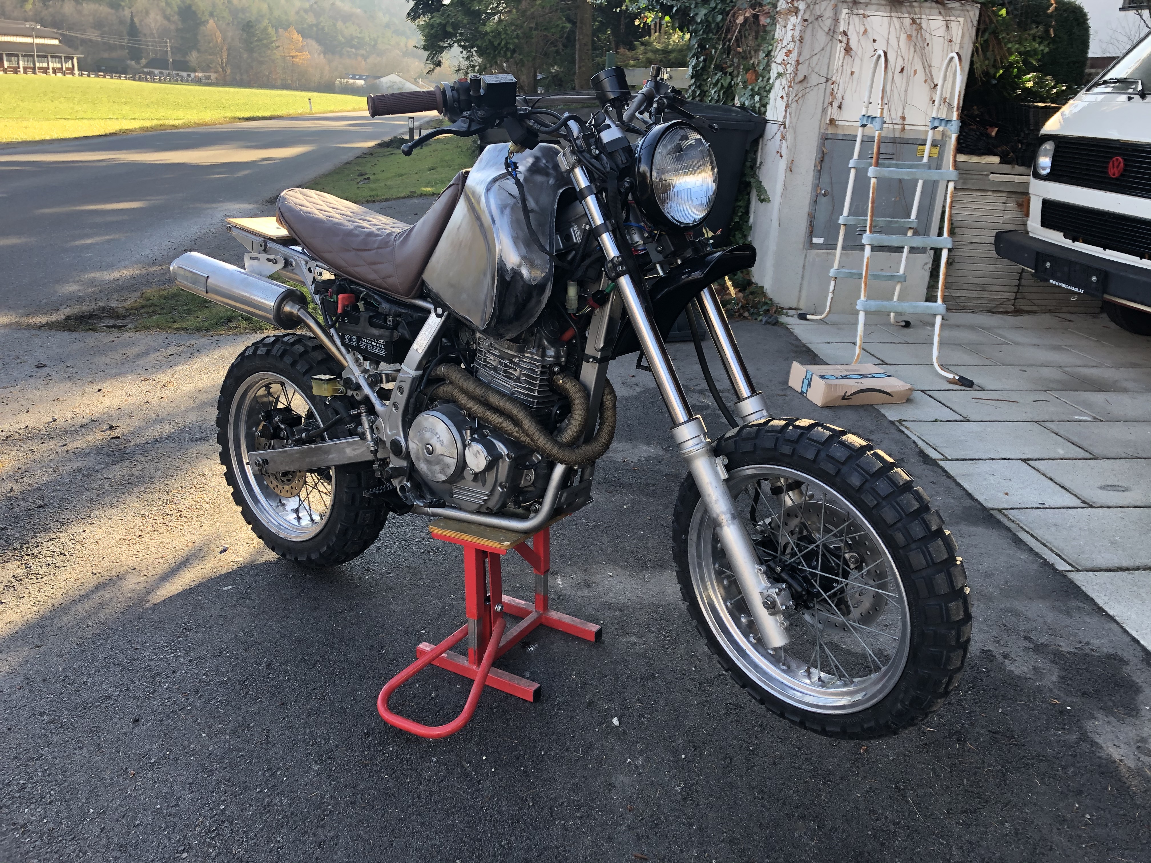Auf Grund der tollen Covid Krise hatte ich endlich etwas Zeit bei der Hand und zufällig ist mir ein Domi Nx 500 um 300 Euro in die Hände gefallen;) Tja nehme ich natürlich. Nach einiger Recherche und Überlegung habe ich schliesslich den Umbau begonnen und mal geschaut was daraus wird. Viele Sachen konnte ich selbst lösen und habe ganz gute Lösungen gefunden. Wo ich jetzt bisschen anstehe und wo ich auf Ideen hoffe wäre der Auspuff. Ich habe jetzt mal von Götz das 2 auf 1Link eingebaut, aber der Slipon den die haben gefällt mir nicht. Habt ihr Ideen oder Erfahrungen? Was passen würde? Bin für jeden Tipp dankbar.