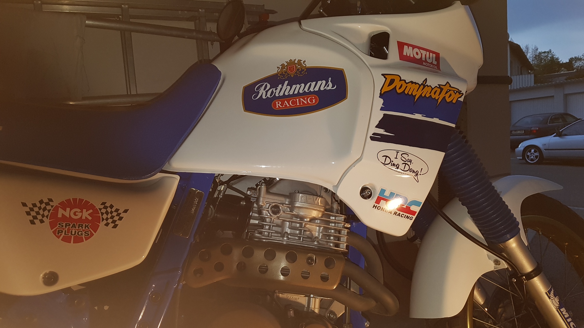 meine Domi sieht etwas langweilig aus. Sie scheint ja orginal zu sein, aber doch nicht so der Burner. Ich spiele mit dem Gedanken mit Folientechnik das Pferd etwas bunter zu machen. Als Anlehnung habe ich die " Rothmans Africa Twin " genommen. Soll nicht gleich werden (da würde ja ein Zylinder fehlen ? nachrüsten ? ). Doch aber etwas mehr Eycatcher. Wenn ich mal ganz mutig bin, versuche ich mal einen Scrambler Umbau, da habe ich aber schon gelesen, dass das beim TÜV doch aufwendig und teuer werden kann. Jetzt meine Frage, hat jemand Erfahrung mit Folie oder Sticker ? Die Sticker im Internet versprechen bis zu 5 Jahre Garantie ???? sind aber meistens nur 10 bis 15 cm groß. Folientechnik habe ich bei meiner Horex gemacht, und die hat lange gehalten. So und jetzt stelle ich noch ein paar Bilder rein. Die Logos sind nur auf Ink-Jet Papier und mit Tesafilm angeklebt um mal eine Vostellung zu haben. Sind auch wild durcheinander und nich symetrisch angebracht. Das sage ich lieber gleich bevor jemand meint meckern zu müssen. Über ein paar Tips würde ich mich freuen.