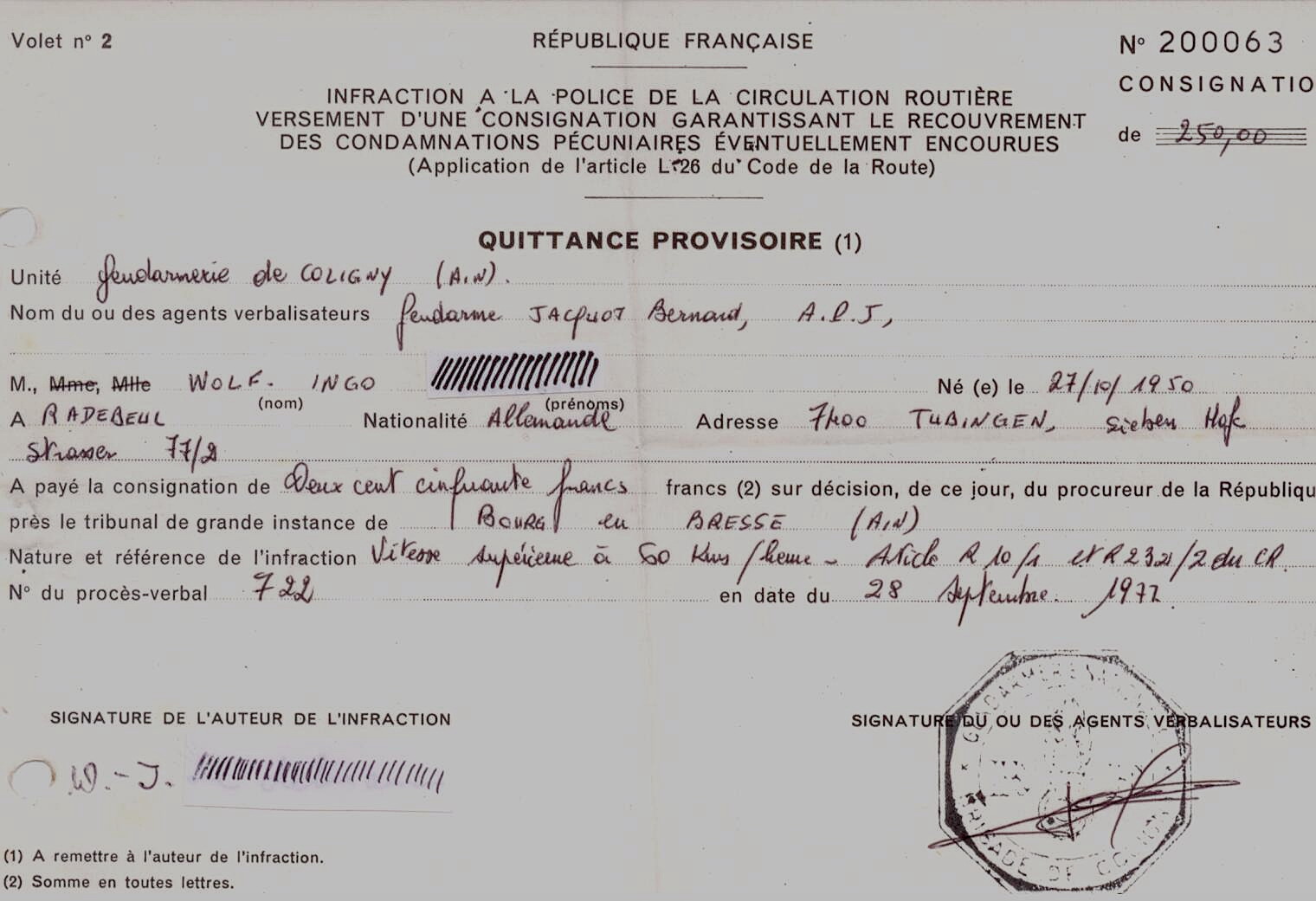 Am nächsten Morgen hatten wir es offenbar recht eilig, von diesem gastlichen Ort wieder wegzukommen. Heute fände ich es sehr ungewöhnlich, wenn ortsansässige Franzosen ein kilometerlanges Tempolimit von 60 Knoten strikt einhielten. Damals tat ich es leider nicht und überholte zügig die elenden Schleicher vor mir. Als die lang gestreckte Baustelle zu Ende war, kam der kleine Ort Coligny. Dort standen zwei Beamte der Gendarmerie und winkten mich energisch heraus. 102 kmh hatten sie gemessen. Das war Rekord an diesem Vormittag. Rund 50 Euro kostete der Spaß. Das tat zwar weh, stellte aber im Vergleich zu heutigen Strafen ein ausgesprochenes Schnäppchen dar. Trotzdem grüße ich die Polizeiwache in Coligny auch gegenwärtig noch mit dem erhobenen Ringfinger, wenn ich an ihr vorbeirolle. Mit vorschriftsmäßiger Geschwindigkeit, versteht sich.