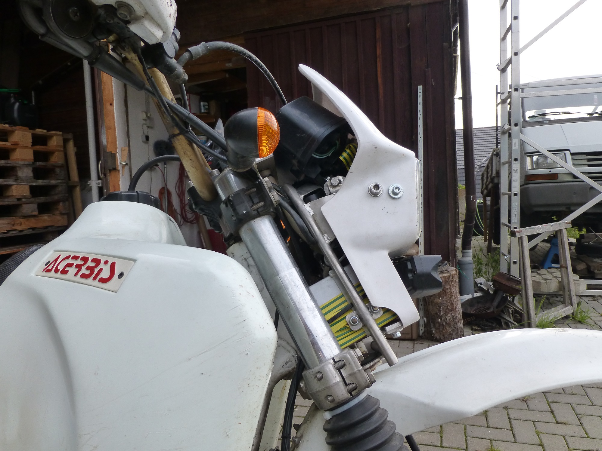 Nächste Herausforderung ist die Befestigung der Lampenmaske. Wenn es nicht unbedingt eine originale XR-Maske sein muss, könnte man eine Maske aus dem Zubehör nehmen (z.B Acerbis Elba find ich echt schick) und die mit den Gummibändern ans Gabelrohr klemmen. Sonst kannst du auch eine obere Gabelbrücke einer XL(XR evtl. auch?) organisieren, die passt und hat zwei angegossene Befestigungslöcher. Du musst dann natürlich noch das Zündschloss tauschen, passt aber.