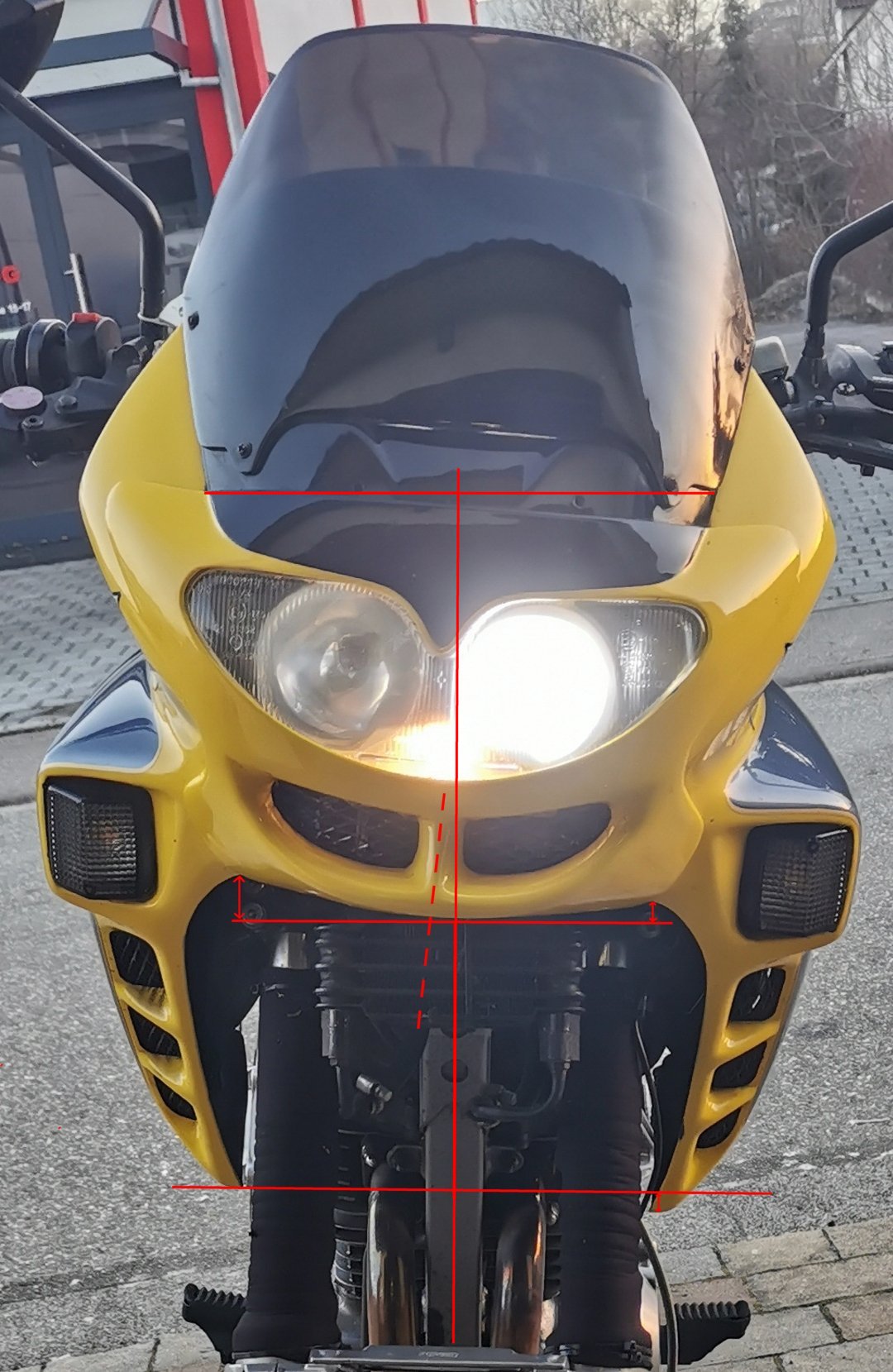Die Spitze der Nasenmitte sowie die Senkrechte Linie der Nase zum Rahmen-Vierkantrohr, am Winkel der Fläche unter der Nase zum Winkel des Moped,