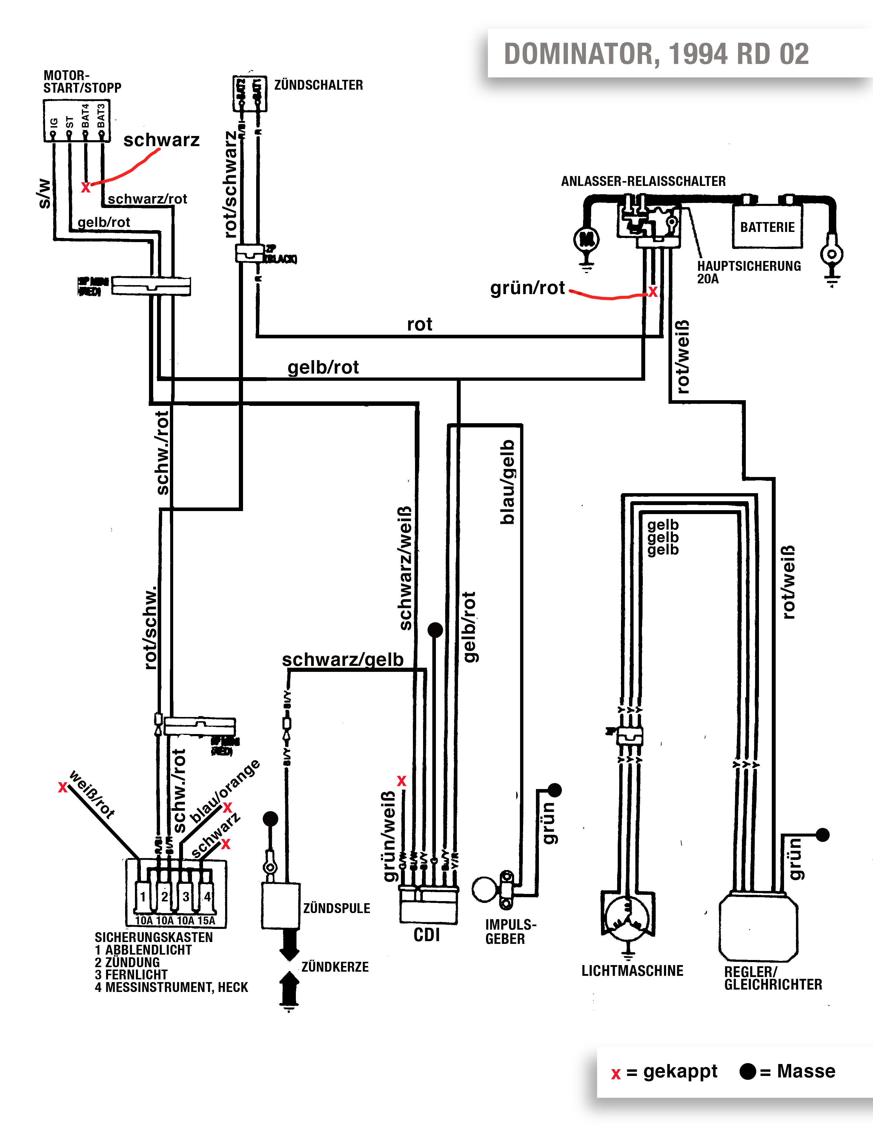 Unsicher bin ich vor allem hinsichtlich der Dioden und des Seitenständerschalters. Die Dioden sind jetzt einfach rausgeflogen (Kuluschalter natürlich auch).
